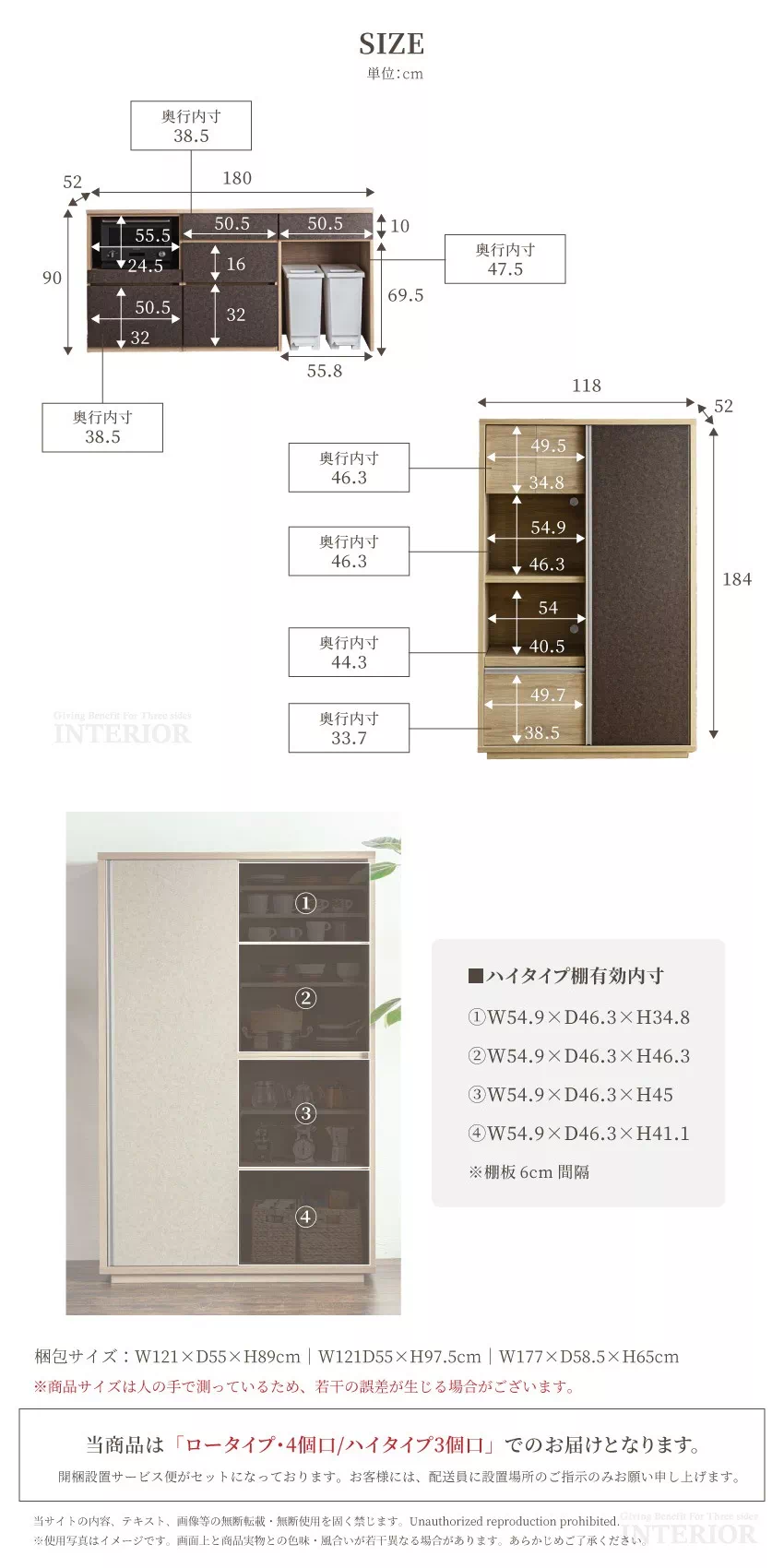| 【120幅】W118×D52×H184cm 【180幅】W180×D52×H90cm 梱包サイズ:W121×D55×H89cm、W121D55×H97.5cm、W177×D58.5×H65cm |