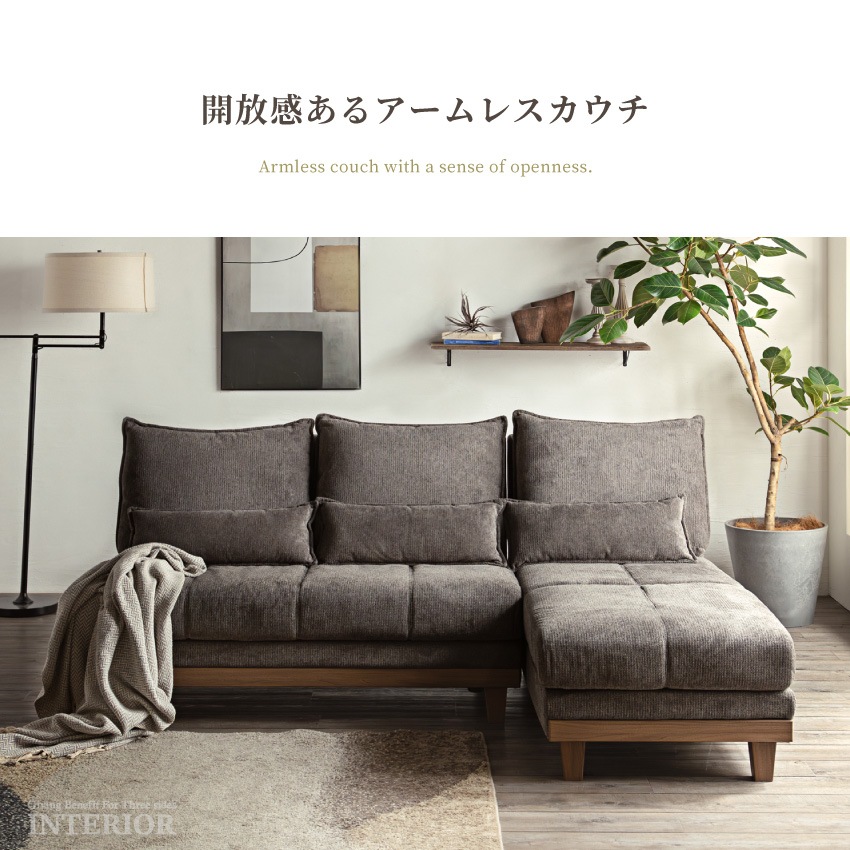 | シンプルデザインのカウチソファ。ひじ掛けのないアームレスデザインで、開放感あるお部屋を演出します。カウチ部分は左右入れ替え可能で、間取りやシーンに合わせてレイアウトを変えられます。張地には肌当たりのいいファブリックを採用。座った時のひんやり感もなく、年中快適にご使用いただけます。脚部は取り外し可能でローソファとしてもお使いいただけます。 |