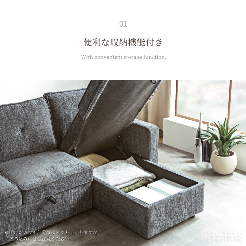 収納機能が便利なワイドサイズのカウチソファ
