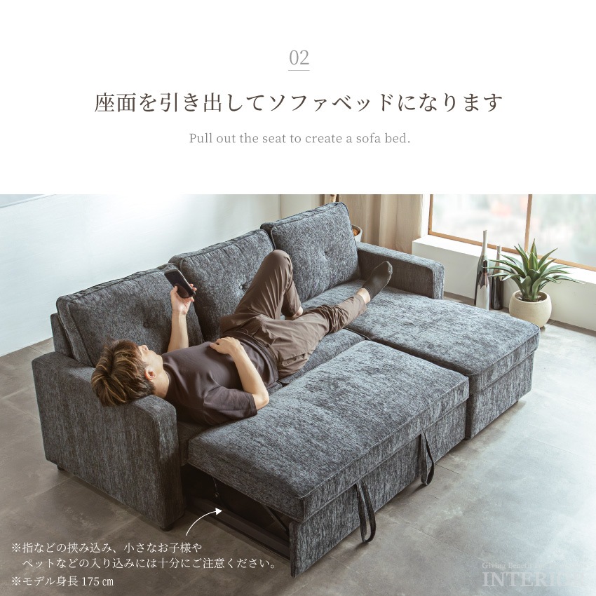 | 床下に収納機能を備えたカウチソファ。ブランケットやクッションなど、かさばりがちな小物をたっぷり収納できます。さらに座面を引き出すとベッドに早変わり!男性でも足を伸ばしてくつろげるほど広々としたスペースができます。座面にはSバネやウェービングベルトなどを採用し、適度な弾力がある快適な座り心地を実現しました。カラーはモダンなダークグレーとグレーの2色展開。 |