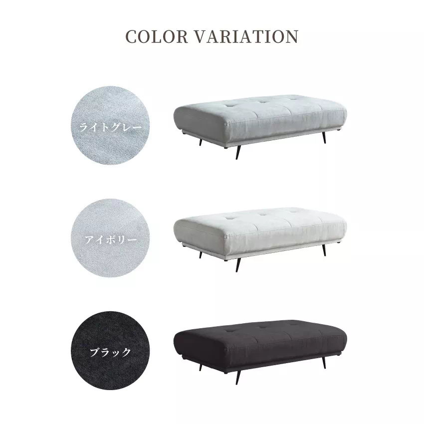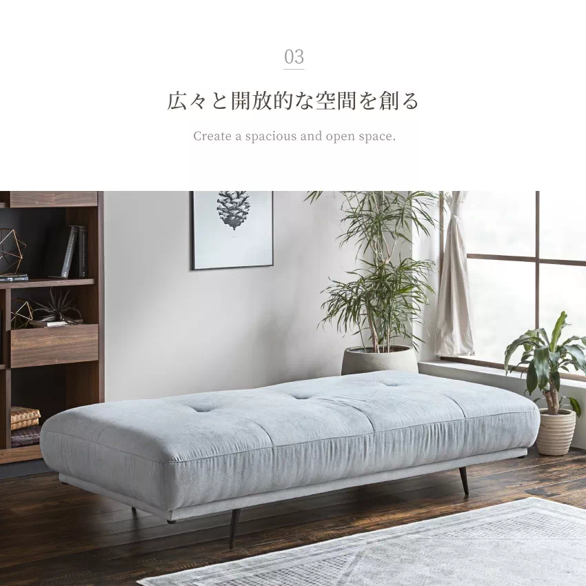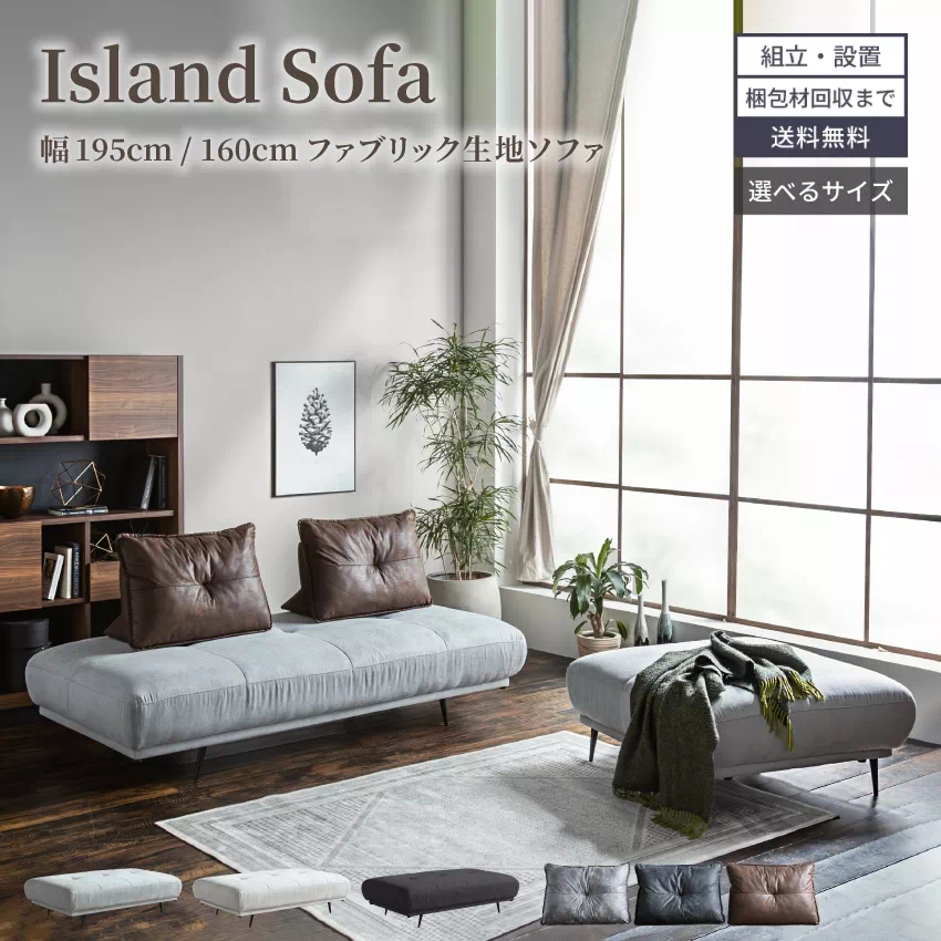 | お部屋に合わせて選べる豊富なサイズ展開が魅力のアイランドソファ。背もたれがないため、開放的な空間に見せてくれます。張地にはファブリック素材を採用。さらりとした手触りで年中快適にお過ごしいただけます。ソファ本体にはクッションが付属。大きめサイズで背もたれとしてもお使いいただけます。 |