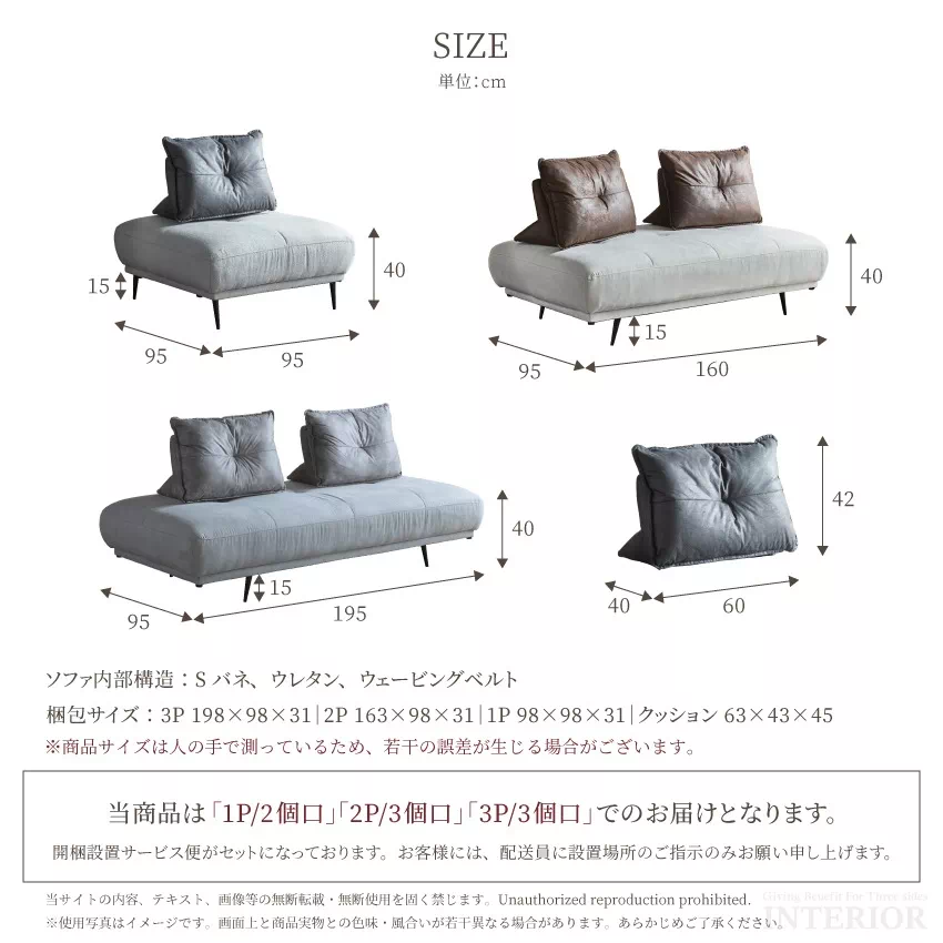 | 1人掛け:W95×D95×H40cm 2人掛け:W160×D95×H40cm 3人掛け:W195×D95×H40cm 背クッション:W60×D40×H42cm 梱包サイズ 3P:198×98×31cm 2P:163×98×31cm 1P:98×98×31cm クッション:63×43×45cm |
