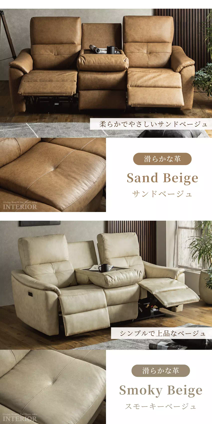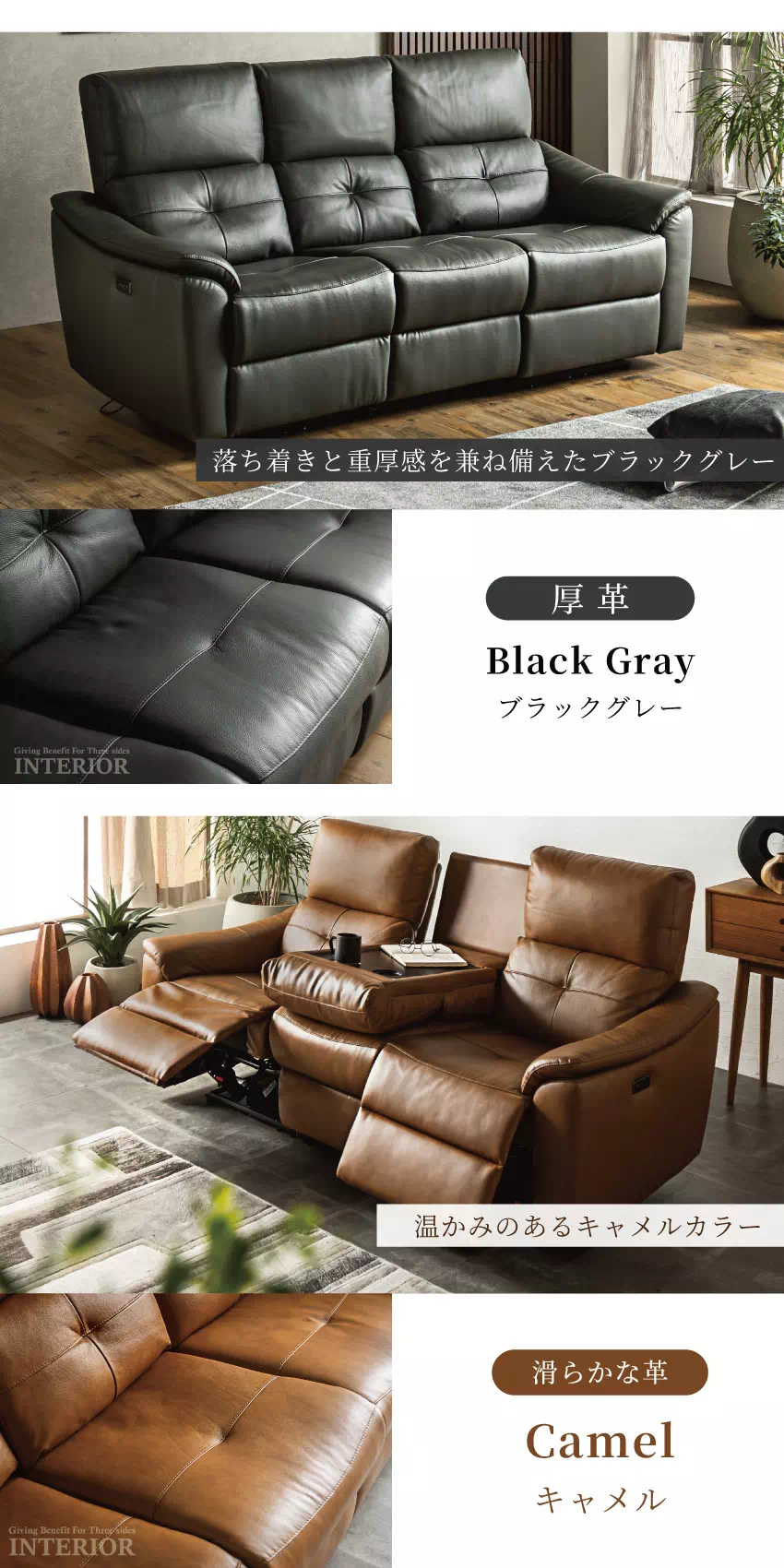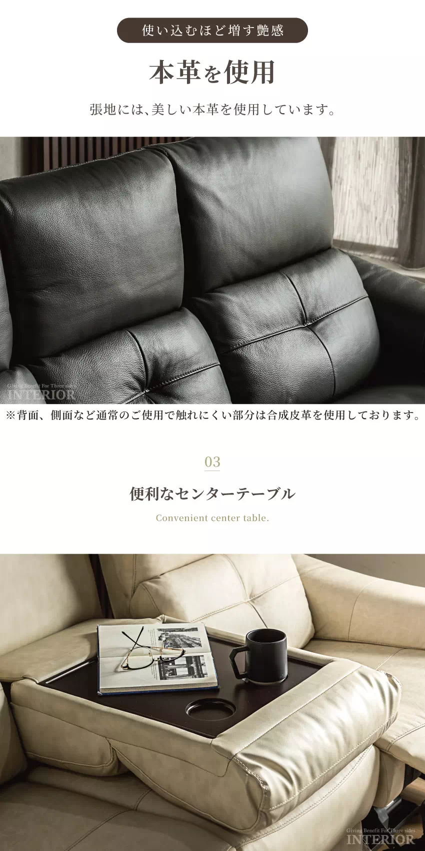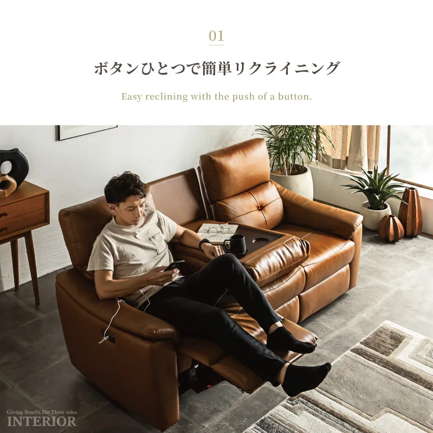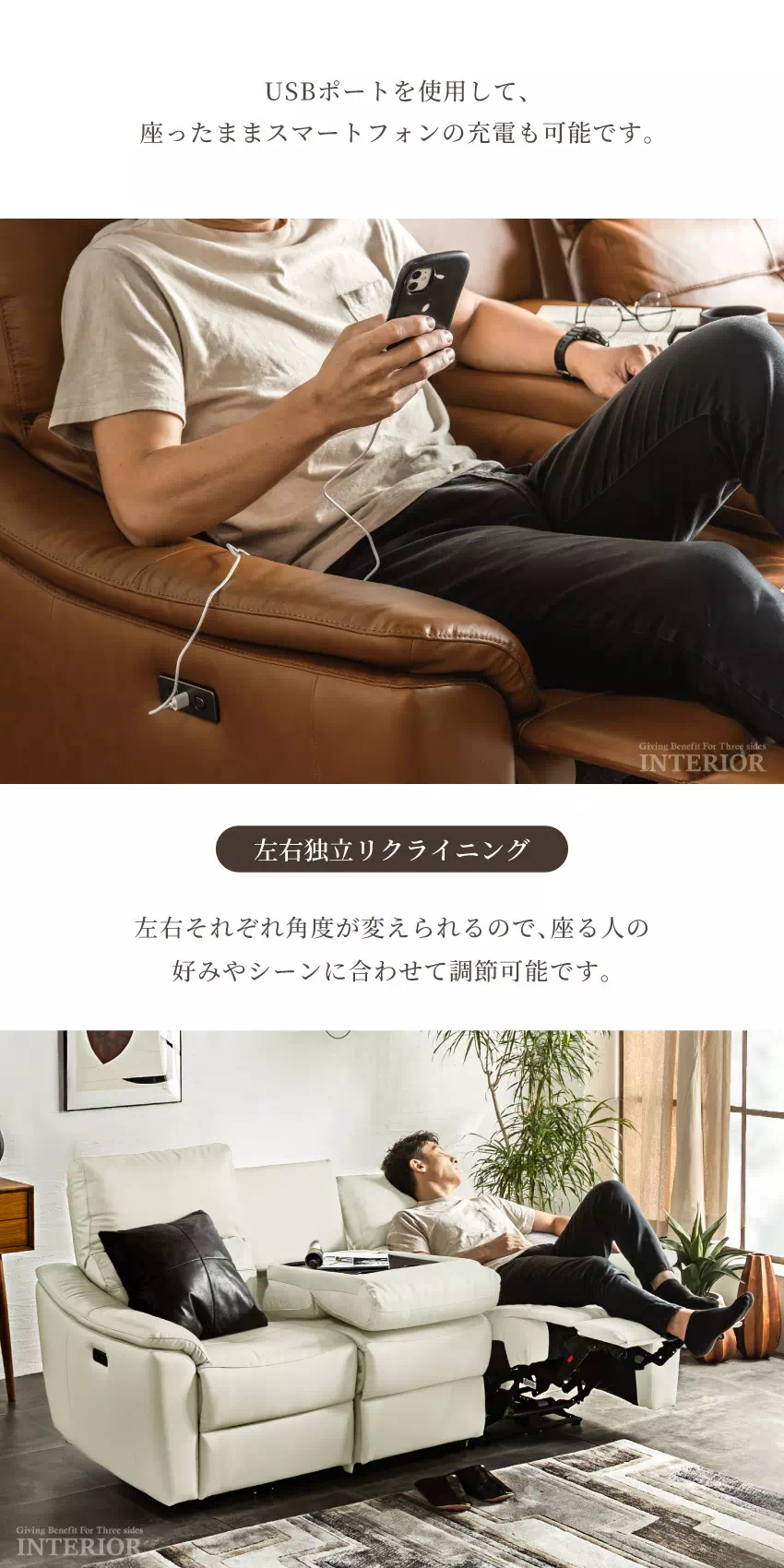 | ゆったり座れる幅200cmの電動ソファです。ボタンを押すだけで簡単にリクライニングできます。ボタンにはUSBポートが付いており、座ったままスマートフォンやゲーム機の充電が可能です。張地には本革を使用しており、高級感溢れる仕上がりに。中央部にはドリンクホルダー付きのセンターテーブルを完備しております。 |