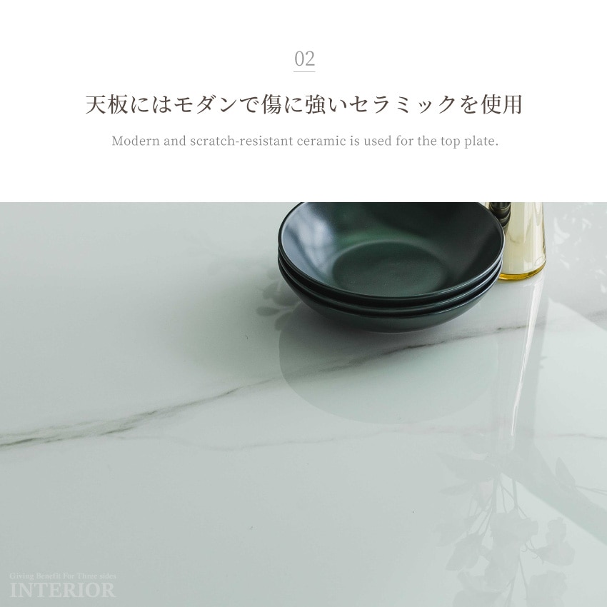 | シーンに合わせて天板の幅を変えられる伸長式ダイニングテーブル。160cmから220cmに拡大でき、来客時にも対応できます。天板は熱や水に強いセラミックを採用。表面が硬く傷がつきにくいため、綺麗な状態で長くお使いいただけます。 |