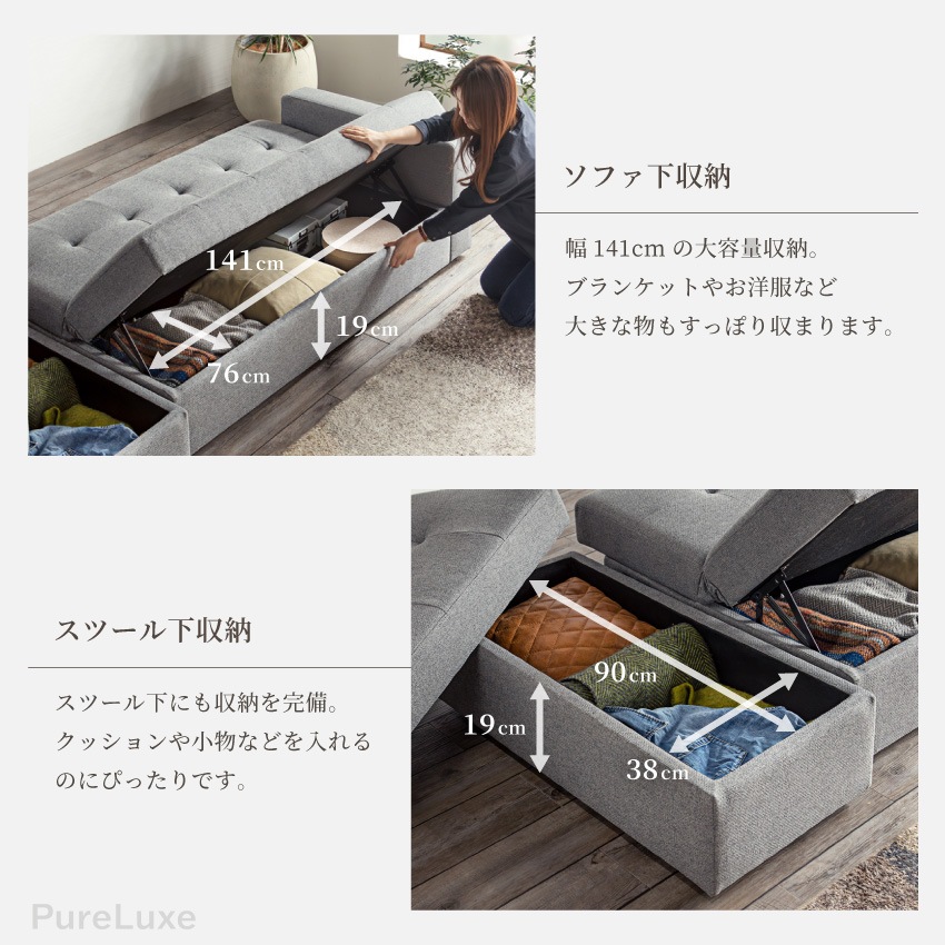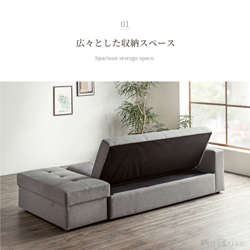 | 大容量の収納を備えた多機能ソファベッド。座面下に大きな収納スペースがあり、お洋服やブランケットなどかさばる物もすっぽり収まります。付属のスツールにも収納があるため、リビング周りをすっきり片づけられます。ソファとして使うのはもちろん、背もたれを倒せばベッドとしても使用可能です。 |