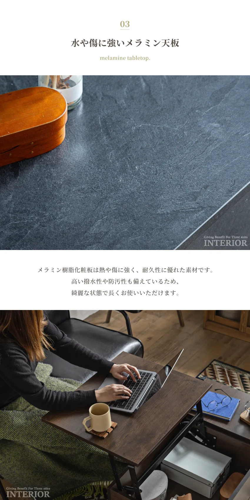 | リフトアップ可能な天板のため、作業が快適。ソファに座ったままでもPC作業や食事などを快適に過ごせるためテレワークにもおすすめ。脚のみ取付なので届いたらすぐに使用できます。 |