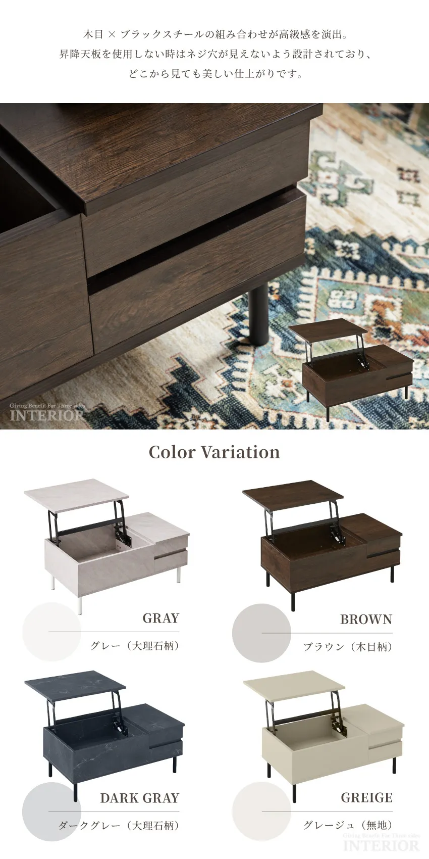 Pure Luxe テーブル 昇降式 ローテーブル リフトアップテーブル センターテーブル 高さ調節 幅90 ブラウン グレー 天板昇降 収納 おしゃれ 昇降テーブル コスメ リフトテーブル リビング 木目調 コンパクト 場所をとらない GB-INTE-1374