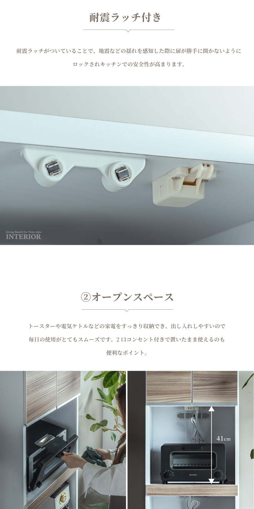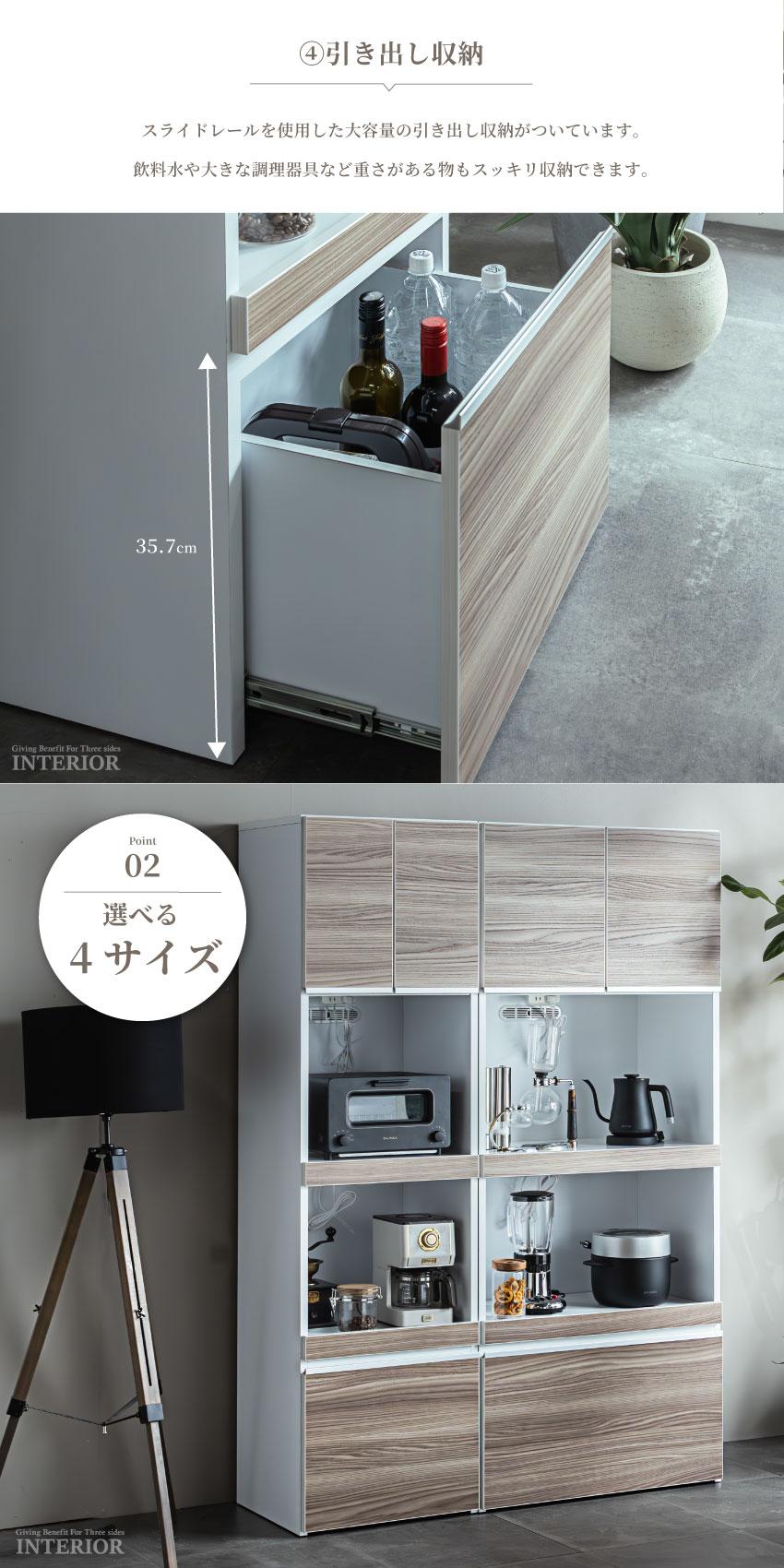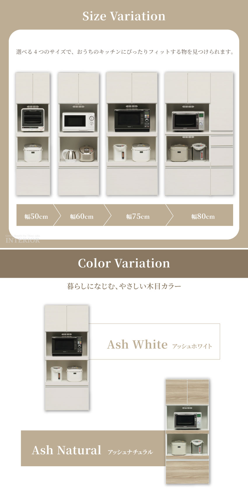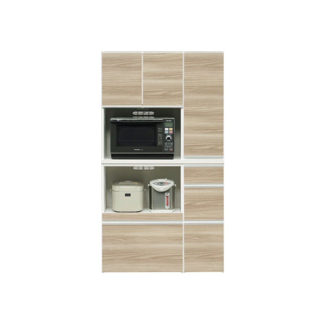 | やさしい木目が映える、ナチュラルな雰囲気のキッチンボード。中央は家電を置けるオープンスペースで、使いやすさも抜群。アッシュホワイトとアッシュナチュラルの2色展開で、明るく爽やかなキッチン空間を演出します。収納力とデザイン性を兼ね備えた、実用性の高い一台です。 |
