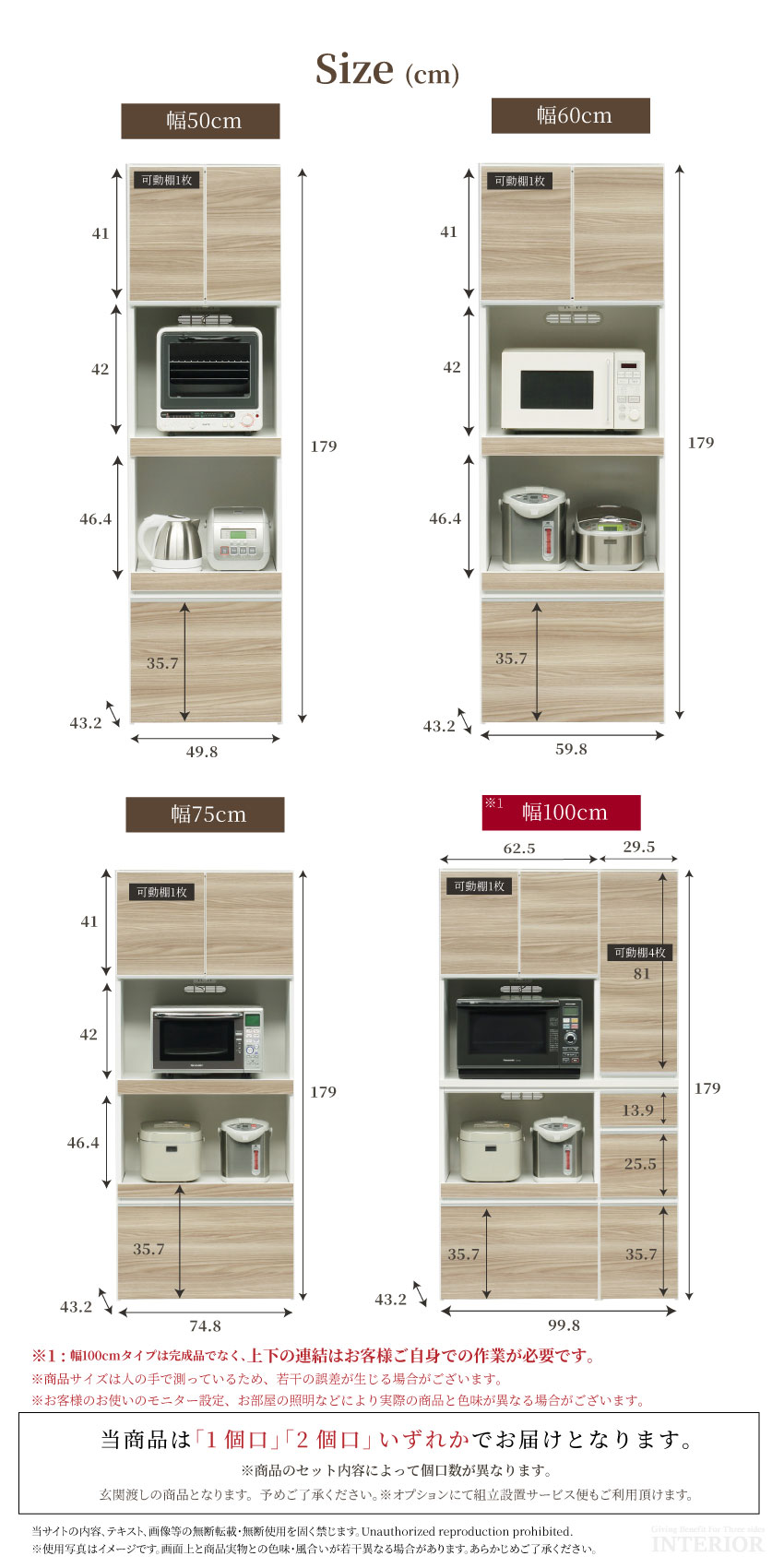 | 幅50cm:幅49.8×奥行き43.2×高さ179cm 幅60cm:幅59.8×奥行き43.2×高さ179cm 幅75cm:幅74.8×奥行き43.2×高さ179cm 幅100cm:幅99.8×奥行き43.2×高さ179cm |