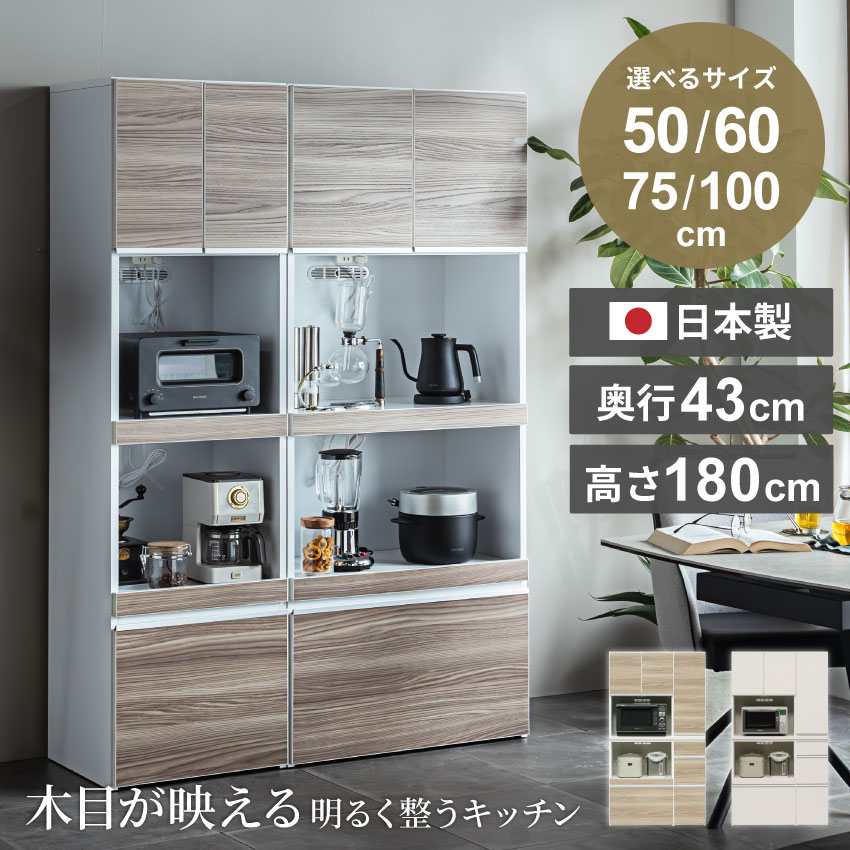 キッチンボード 幅50cm 幅60cm 幅75cm 幅100cm ガラス扉 スリムタイプ 食器棚 アッシュナチュラル ホワイト おしゃれ 奥行き43.2cm 木目調 可動棚 キッチン収納 収納 ダイニングボード ハイタイプ 収納棚 隙間収納 ちょうどいい 日本製 国産