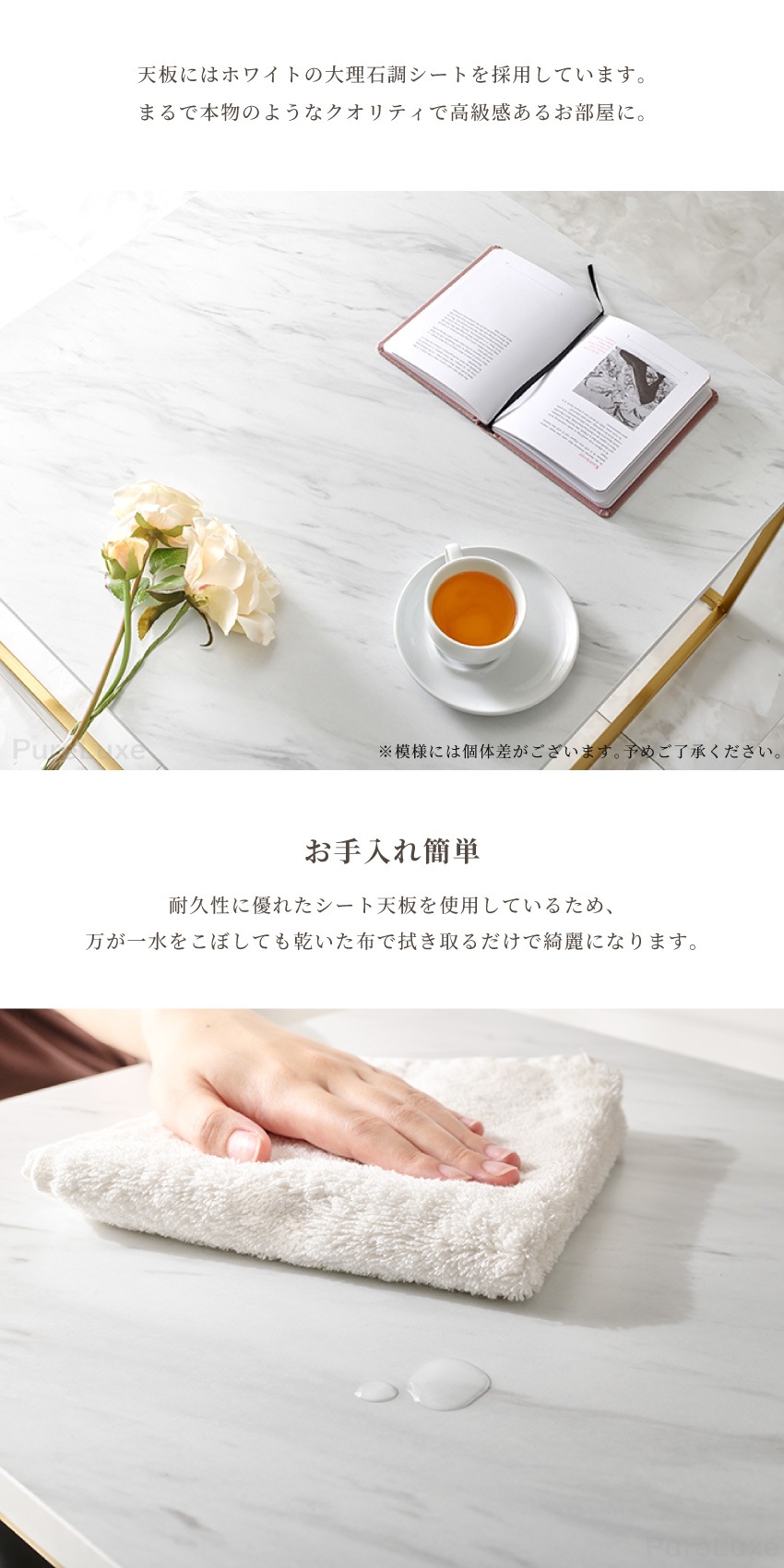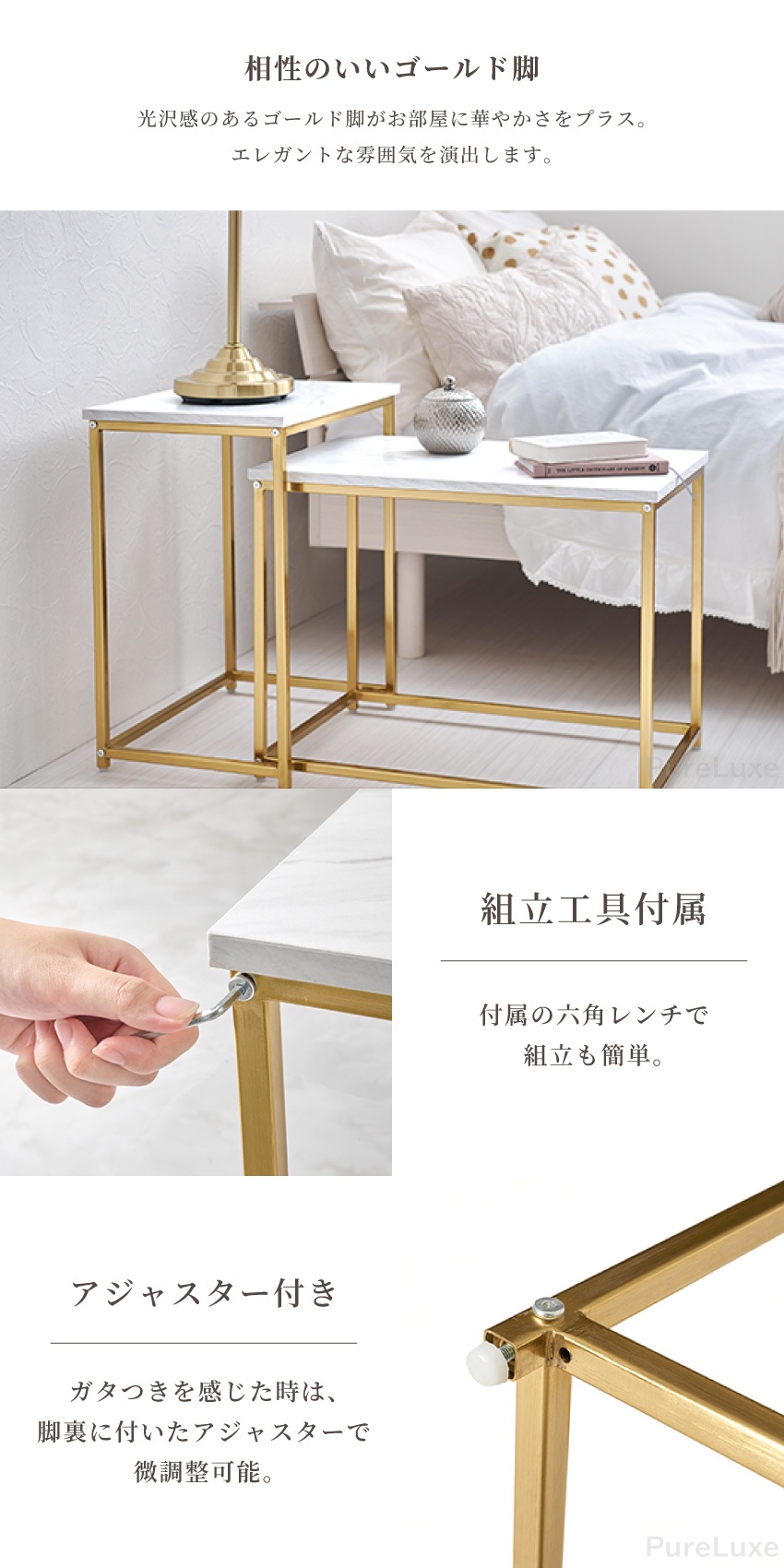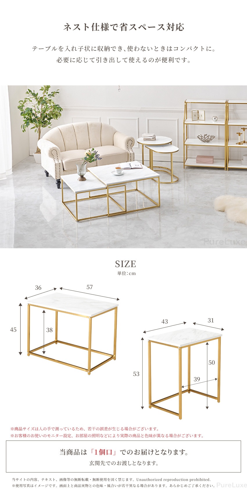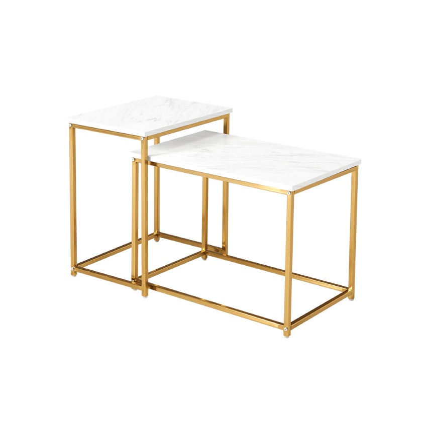 | 大理石風の天板とゴールドのフレームが特徴のおしゃれなネストテーブル。2つのテーブルを重ねて省スペースに使えたり、別々に使用できます。軽くて組み立ても簡単なので、女性でも安心。ソファ横やベッドサイドなど、いろいろな場所で使える便利なテーブルです。 |