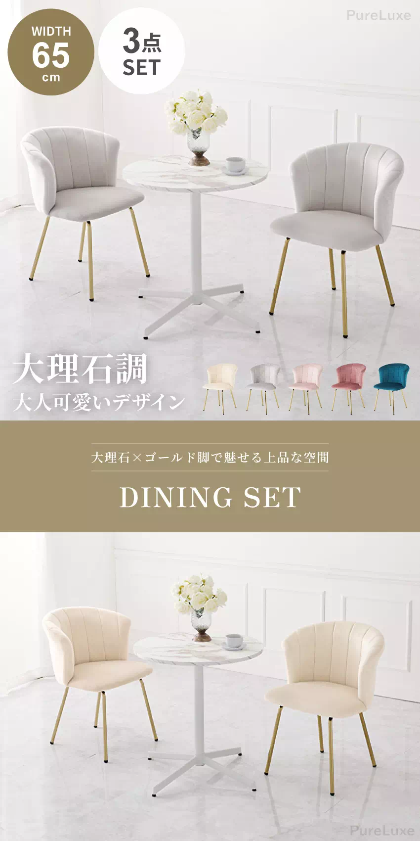 ダイニングテーブルセット ダイニングセット 3点 ダイニングテーブル 65 幅65cm チェア2脚 椅子 ダイニング 2人掛け 食卓テーブル 大理石調 ベロア調 上品 かわいい カフェテーブル