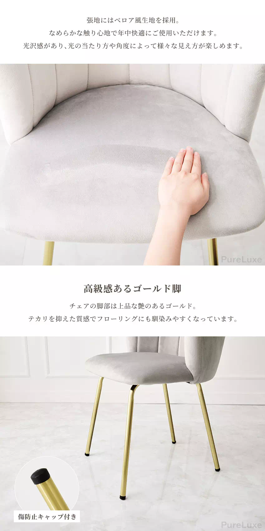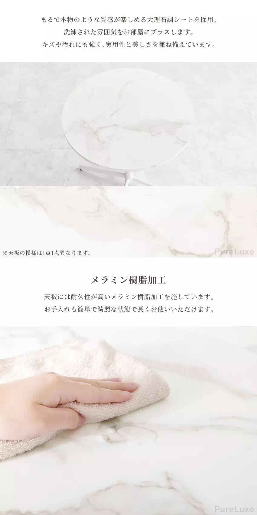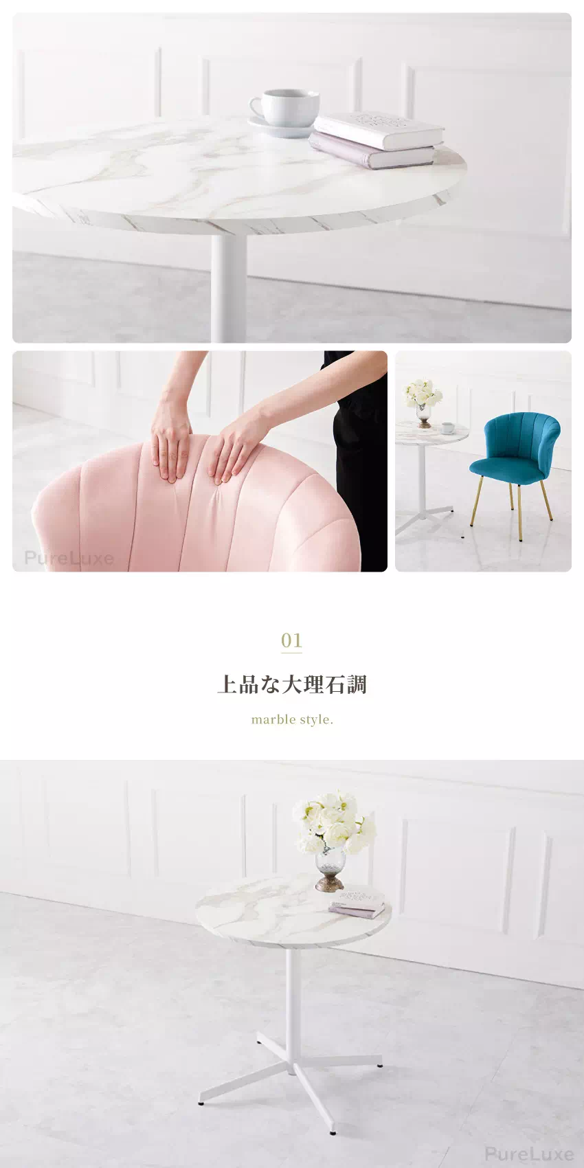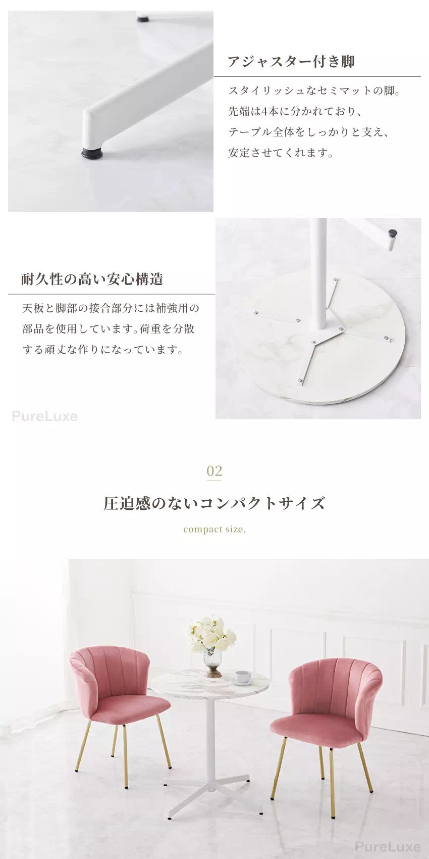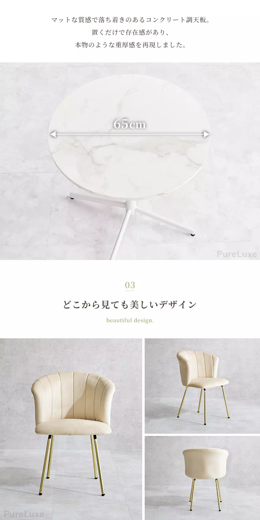 | ベロア調生地のチェアと、リアルな大理石調天板のカフェテーブルを合わせた上品で大人かわいい3点セット。天板にはメラミン樹脂加工を施しているため、お手入れが簡単で耐久性も高いです。チェアは座面が広く、ゆったりくつろぐことができます。ほどよい弾力で沈み込みすぎず、長時間座っていても体が疲れにくいです。 |