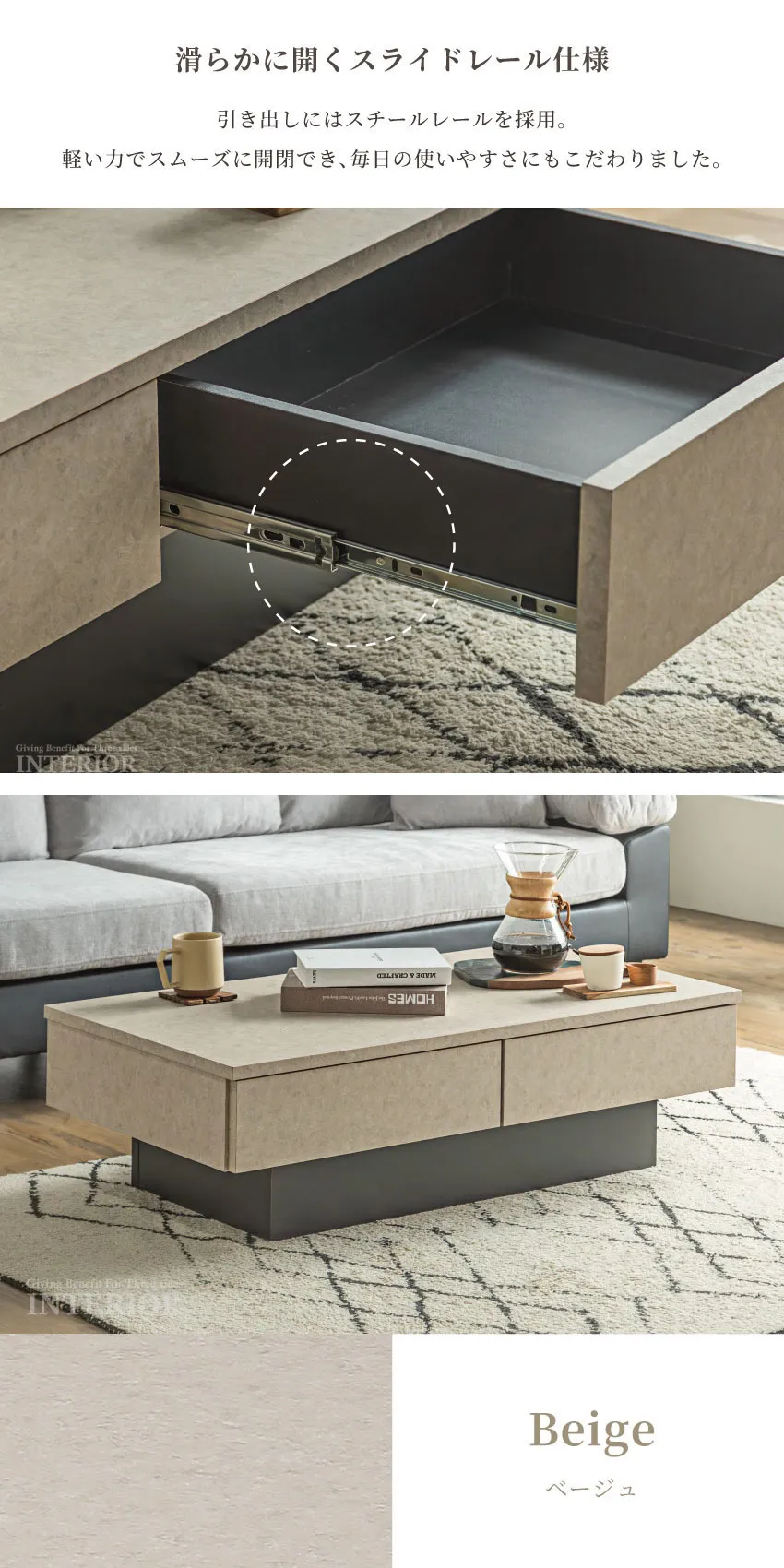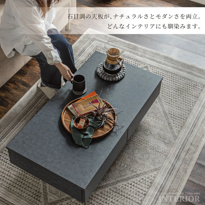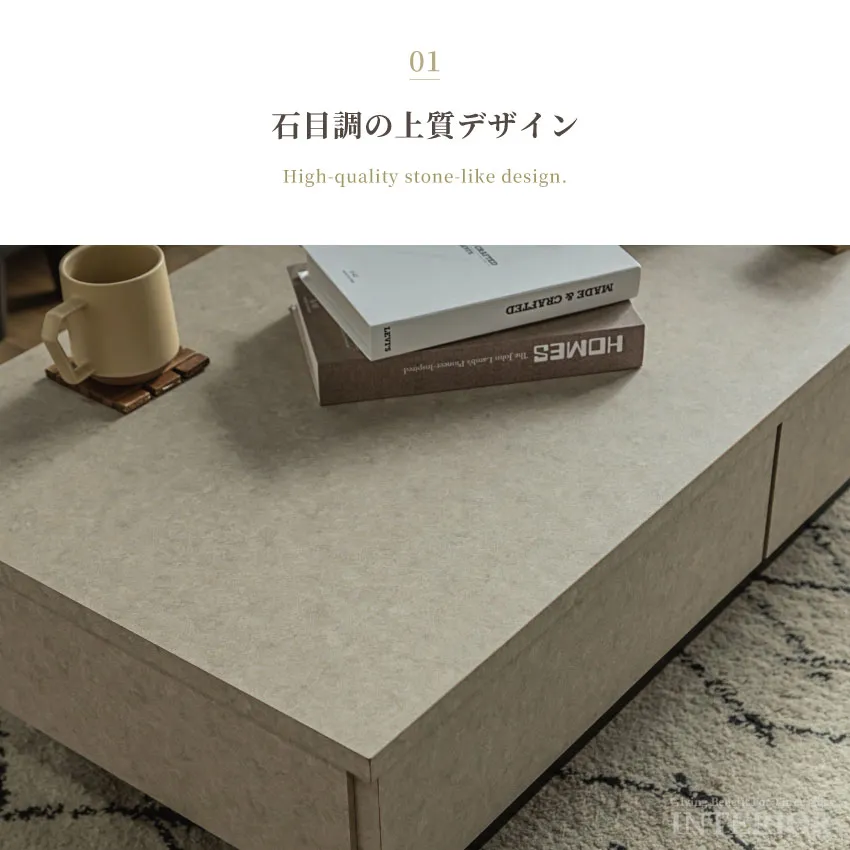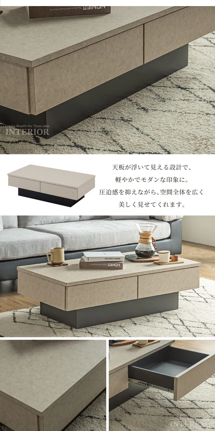 | 落ち着いた石目調のデザインと、機能的な収納を組み合わせたセンターテーブル。2杯の引き出しはリビングの小物をすっきり隠せ、いつでも整った空間を演出します。浮遊感のあるフロートデザインが空間に軽やかさを与え、モダンで上品なリビングを演出。シーンを選ばずに調和する、ベージュ、ブラウン、グレーの3色展開です。 |