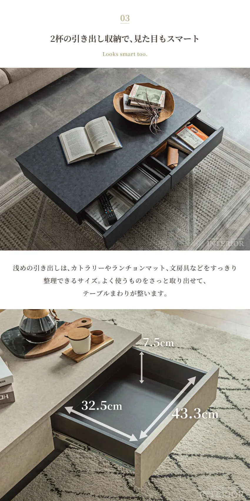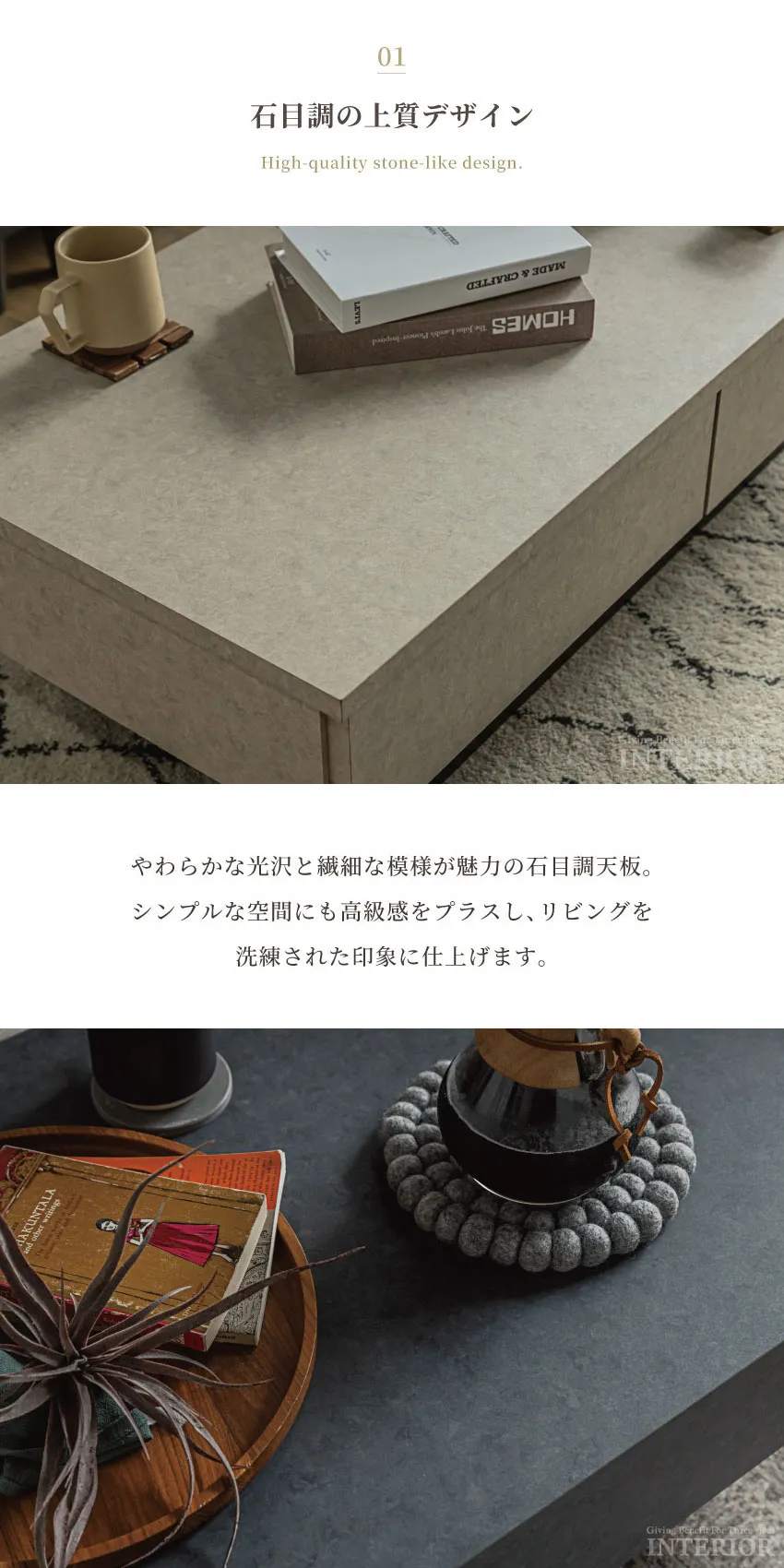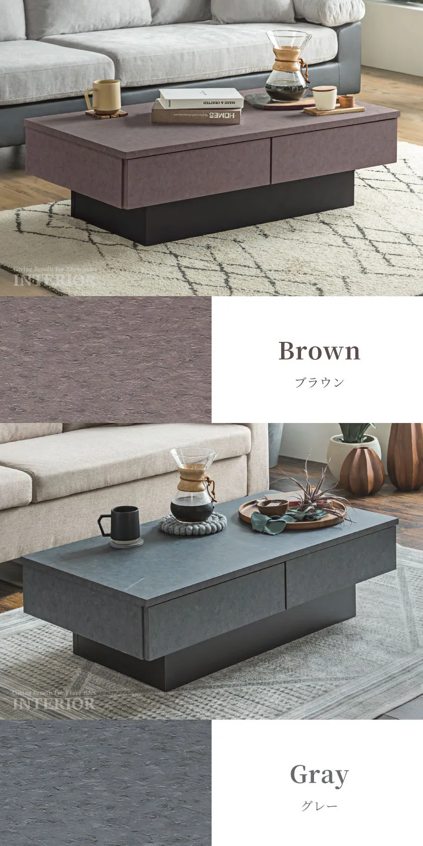 | 落ち着いた石目調のデザインと、機能的な収納を組み合わせたセンターテーブル。2杯の引き出しはリビングの小物をすっきり隠せ、いつでも整った空間を演出します。浮遊感のあるフロートデザインが空間に軽やかさを与え、モダンで上品なリビングを演出。シーンを選ばずに調和する、ベージュ、ブラウン、グレーの3色展開です。 |