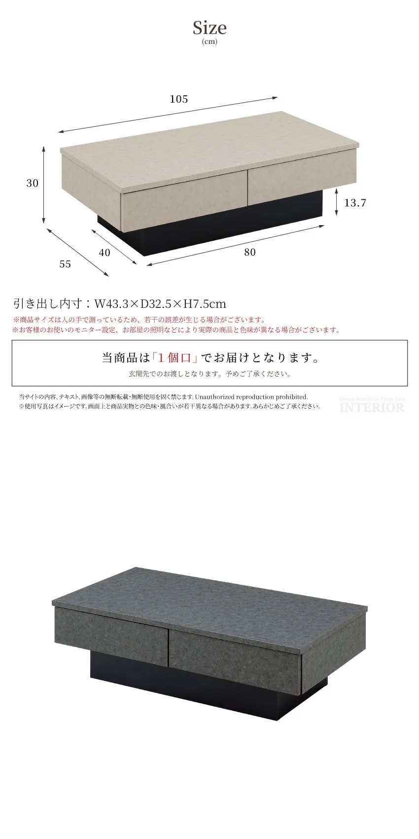 | 幅105×奥行55×高さ30cm 引き出し内寸:幅43.3×奥行32.5×高さ7.5cm |