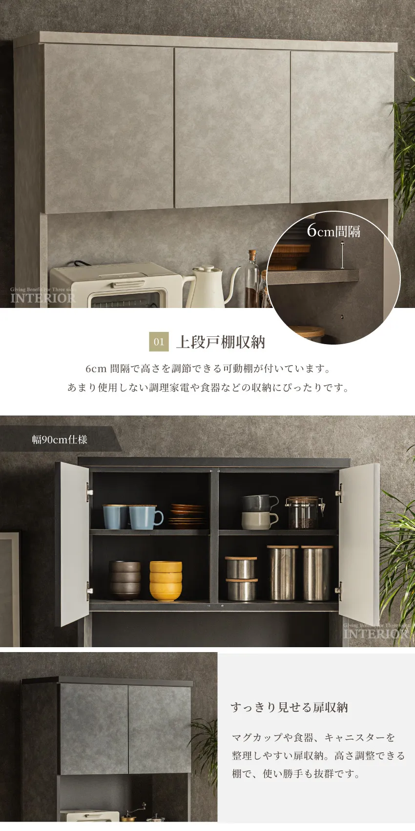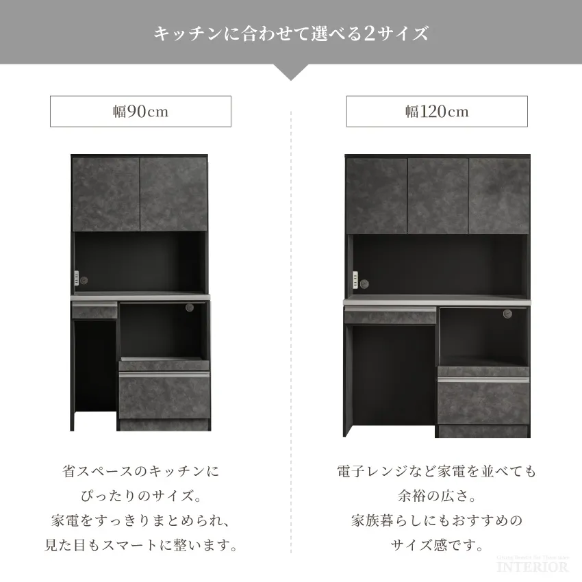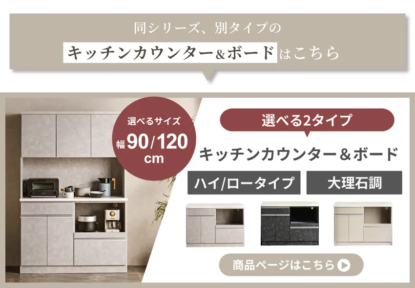 Pure Luxe キッチンボード 食器棚 幅120cm 幅90cm 奥行き44.5cm おしゃれ 国産 おすすめ グレー ライトグレー グレージュ ハイタイプ ロータイプ カップボード ワイド 収納豊富 キッチン収納 レンジ台 キャビネット 扉 引き出し モダン 大容量 新生活