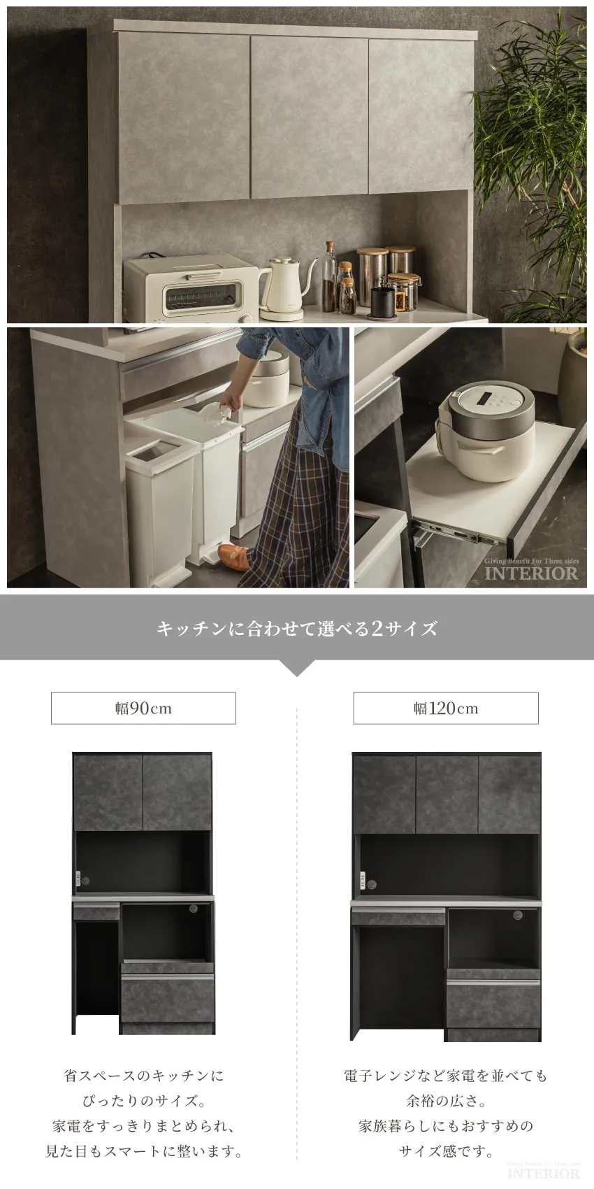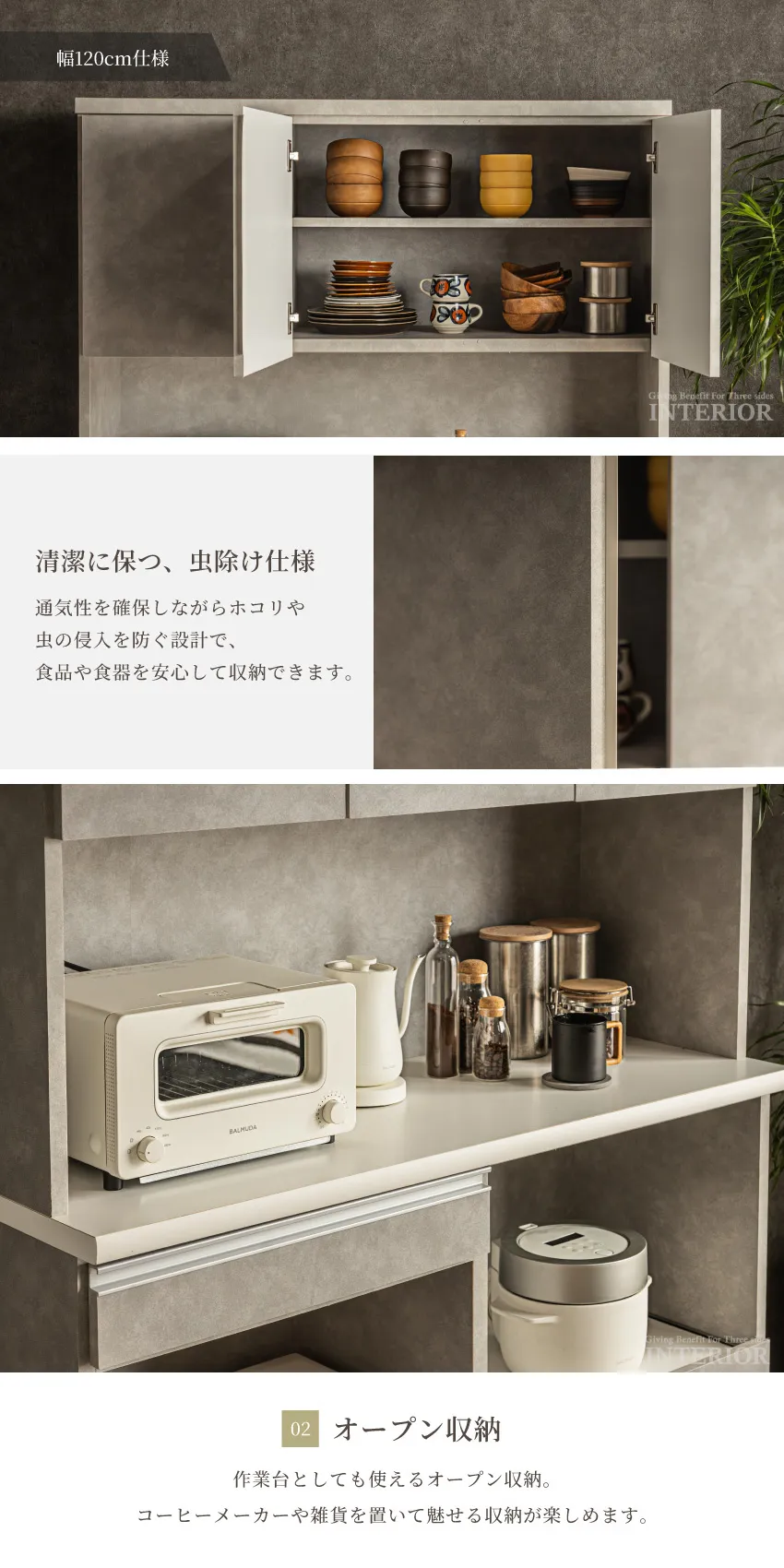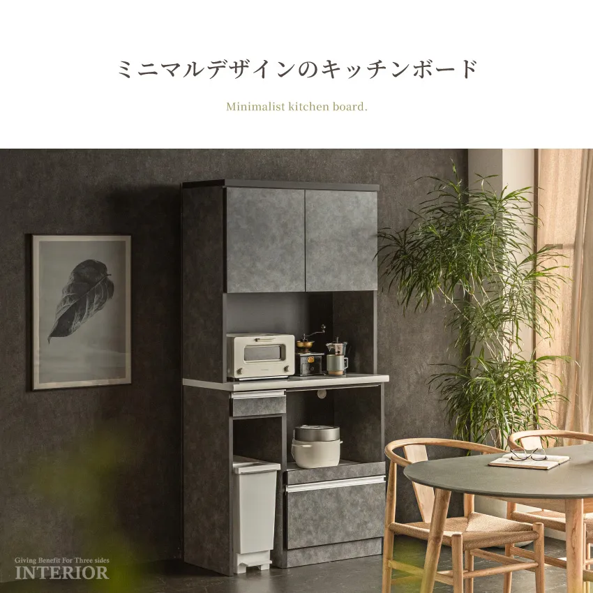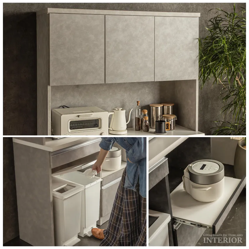| 上品で落ち着いた印象のキッチンボード。人気のライトグレーと、シックなダークグレーの2カラー展開です。上部扉は虫除け仕様で、食器や食品を清潔に収納。下部には分別しやすいダストボックススペースを備え、生活感を隠してキッチンを美しく保ちます。幅120cmのハイタイプは家族暮らしにも十分な収納力。省スペースで使いたい方には幅90cmタイプもご用意。見た目と機能性を両立した、スタイリッシュなキッチン収納です。 |