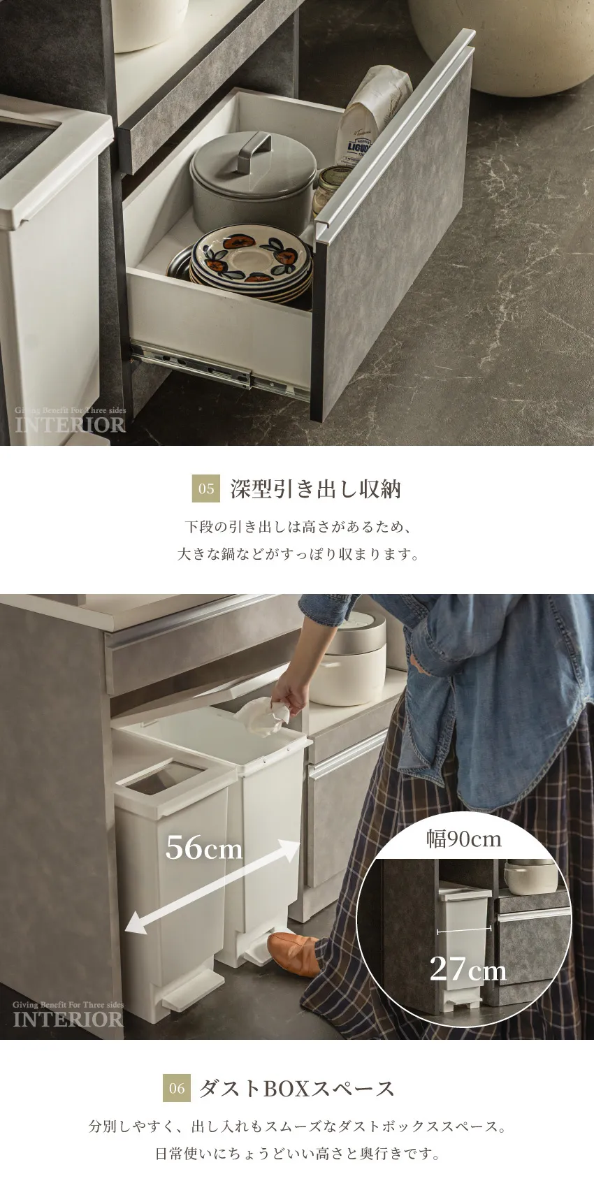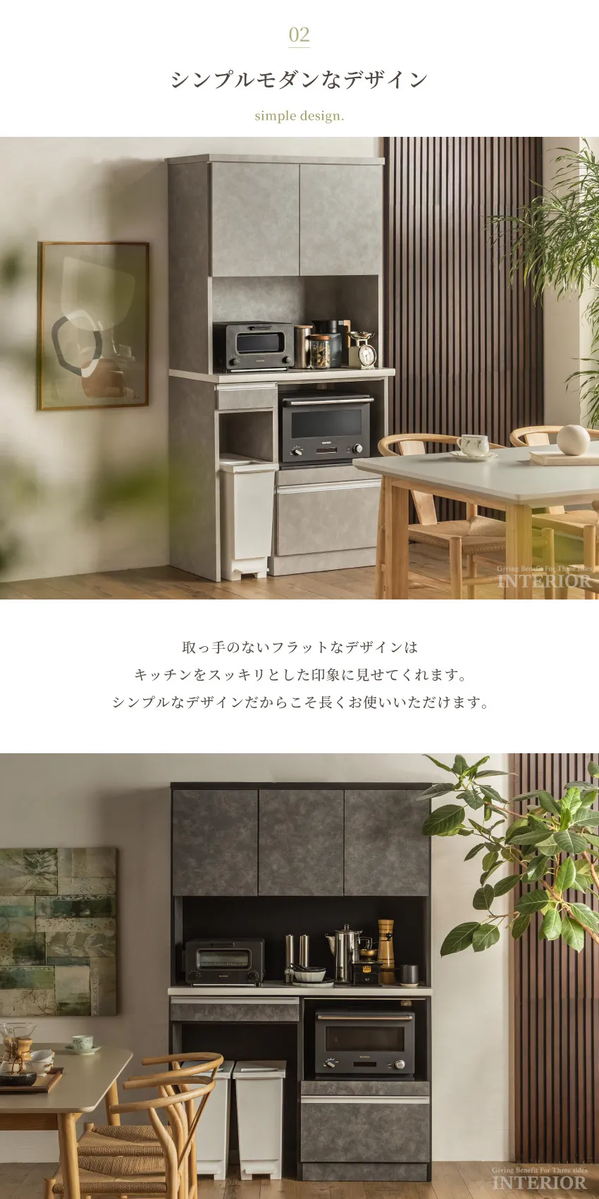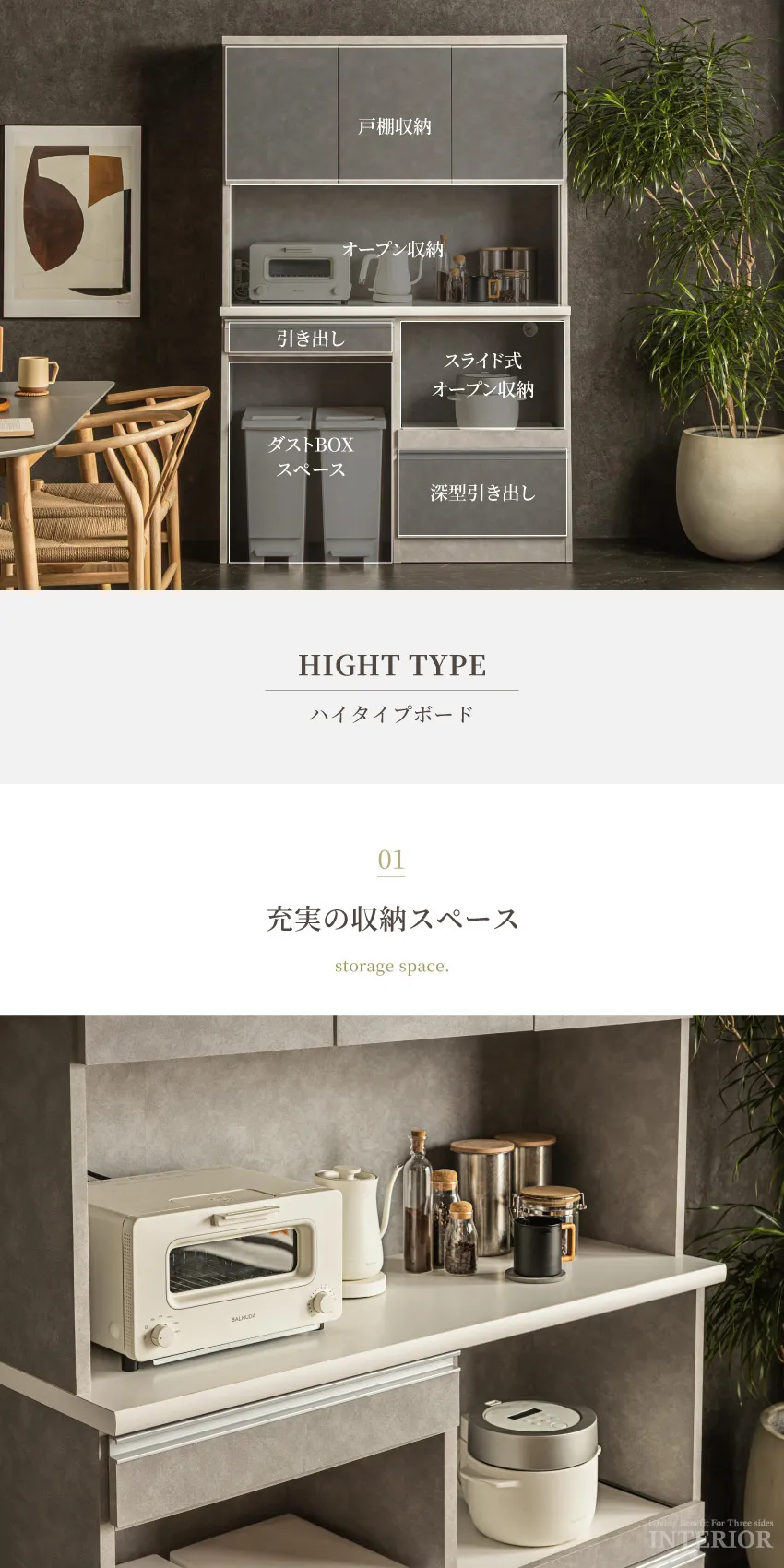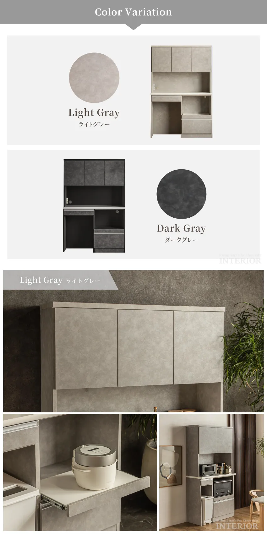 | 上品で落ち着いた印象のキッチンボード。人気のライトグレーと、シックなダークグレーの2カラー展開です。上部扉は虫除け仕様で、食器や食品を清潔に収納。下部には分別しやすいダストボックススペースを備え、生活感を隠してキッチンを美しく保ちます。幅120cmのハイタイプは家族暮らしにも十分な収納力。省スペースで使いたい方には幅90cmタイプもご用意。見た目と機能性を両立した、スタイリッシュなキッチン収納です。 |