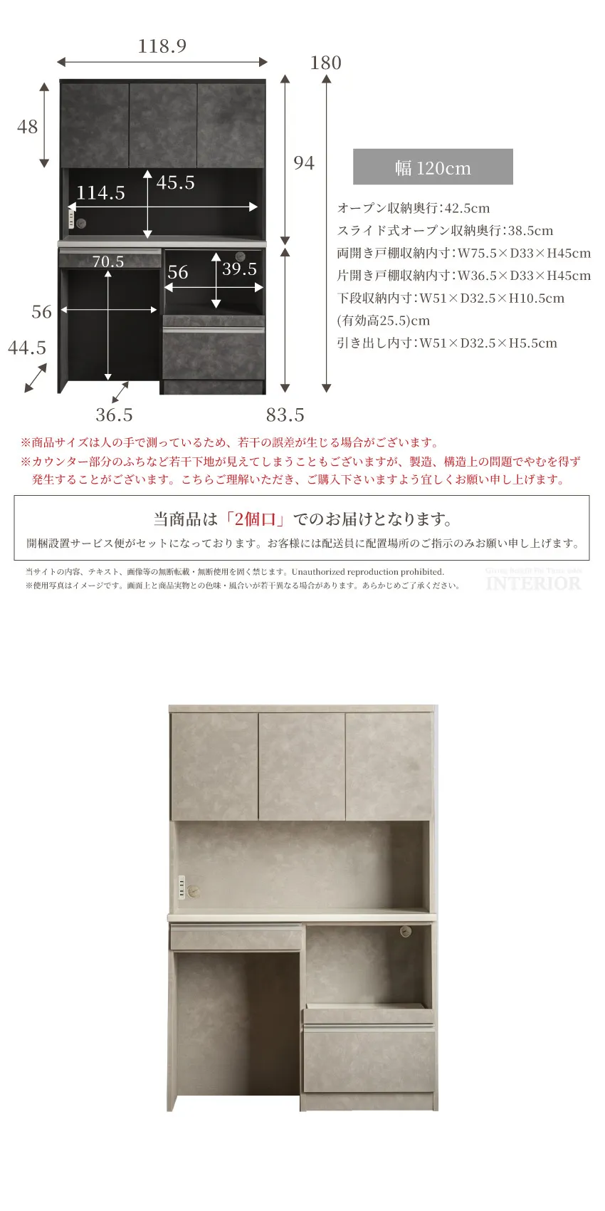 | 120幅:W118.9×奥行き44.5×高さ180cm 90幅:W90×奥行き44.5×高さ180cm |