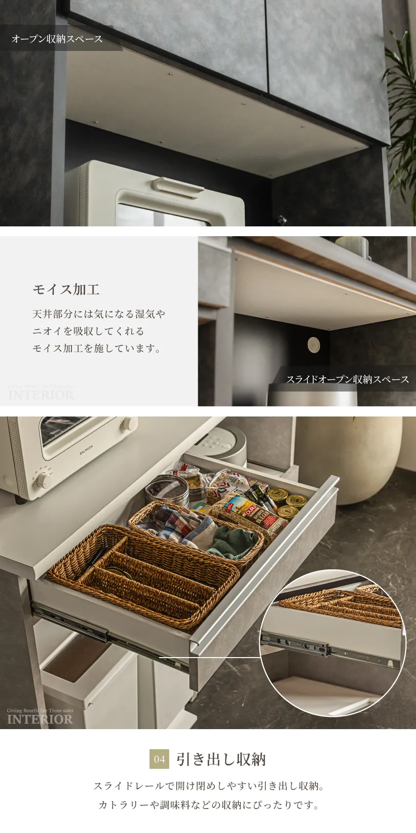 食器棚 ハイタイプ キッチンボード 幅80cm 幅110cm 幅120cm 幅130cm グレー モイス付 カップボード 国産 おしゃれ 高さ190cm 奥行き43cm キッチン収納 引出し Moiss スライド 日本製 大理石調 扉収納