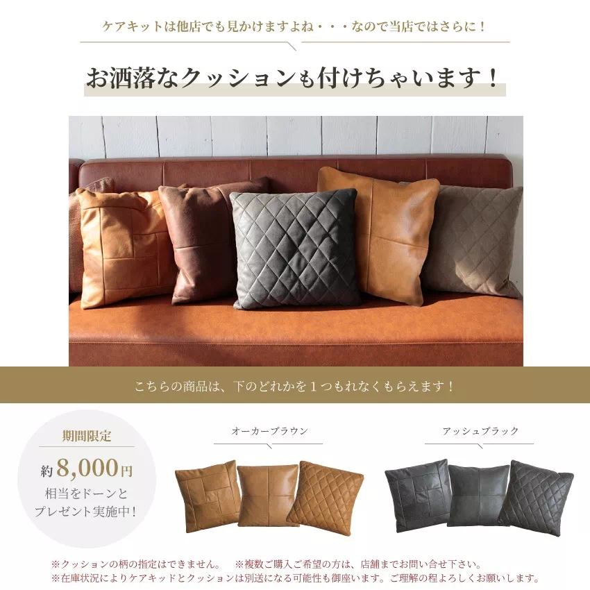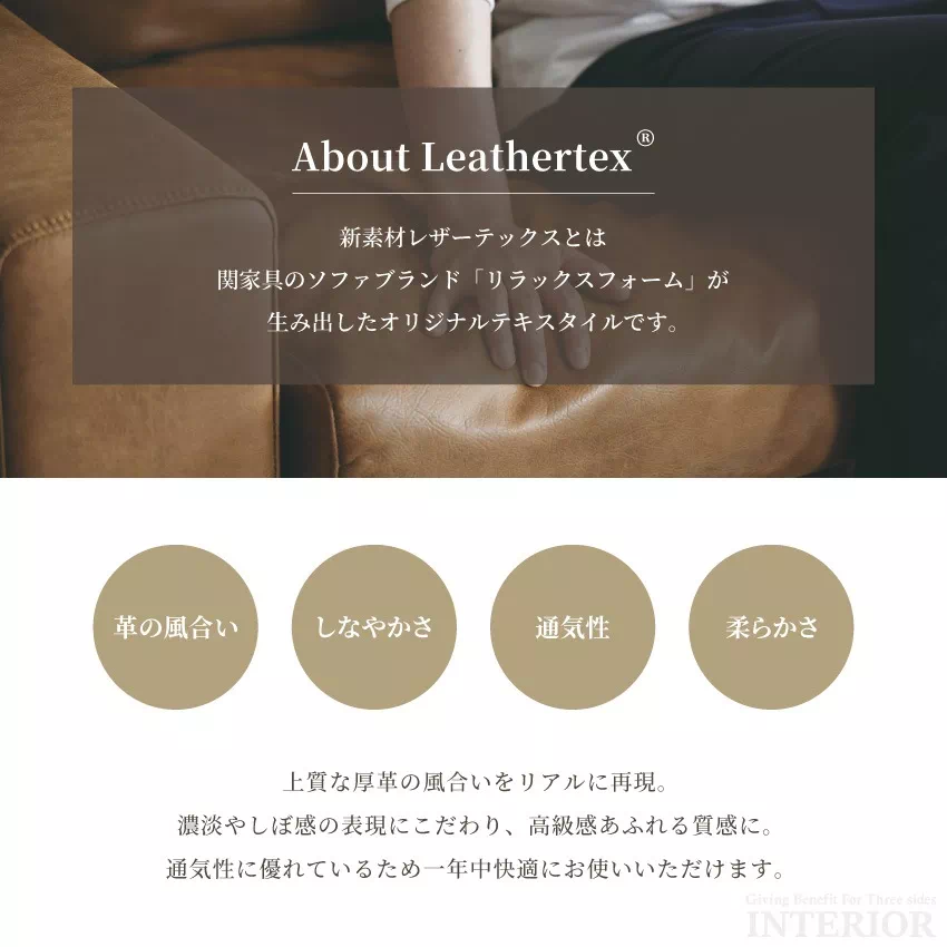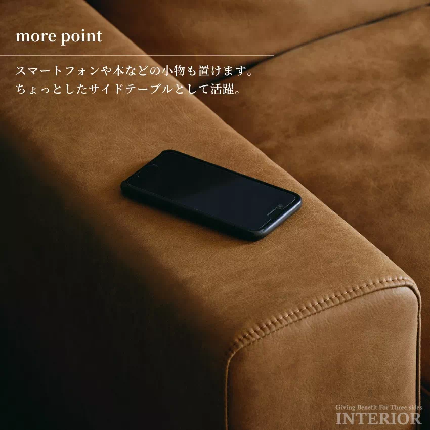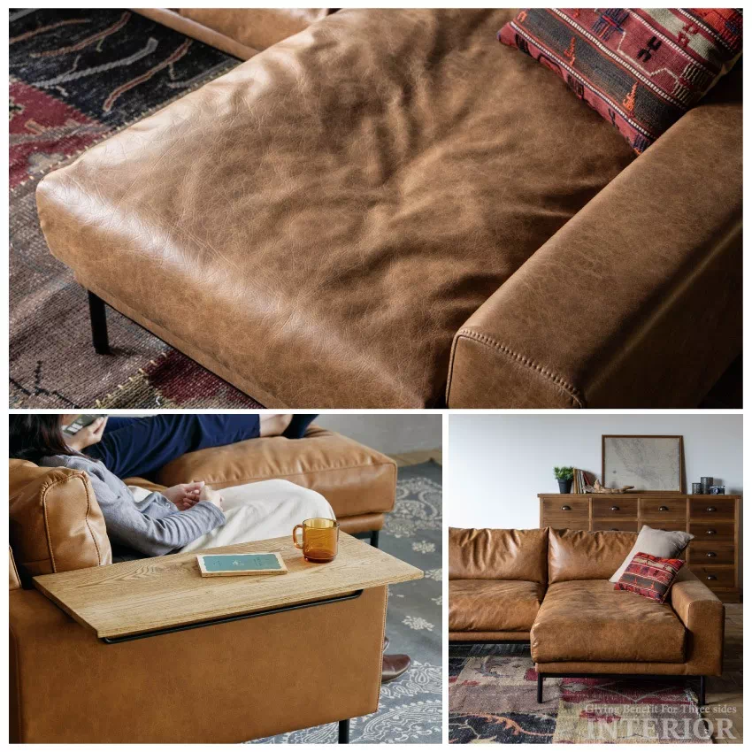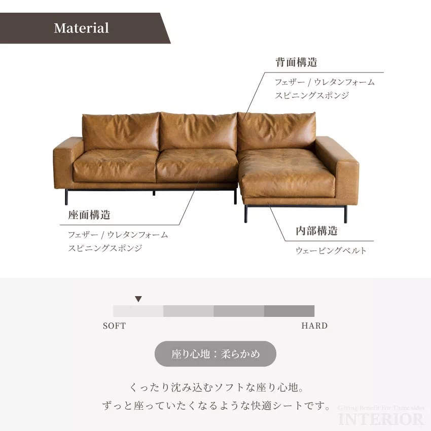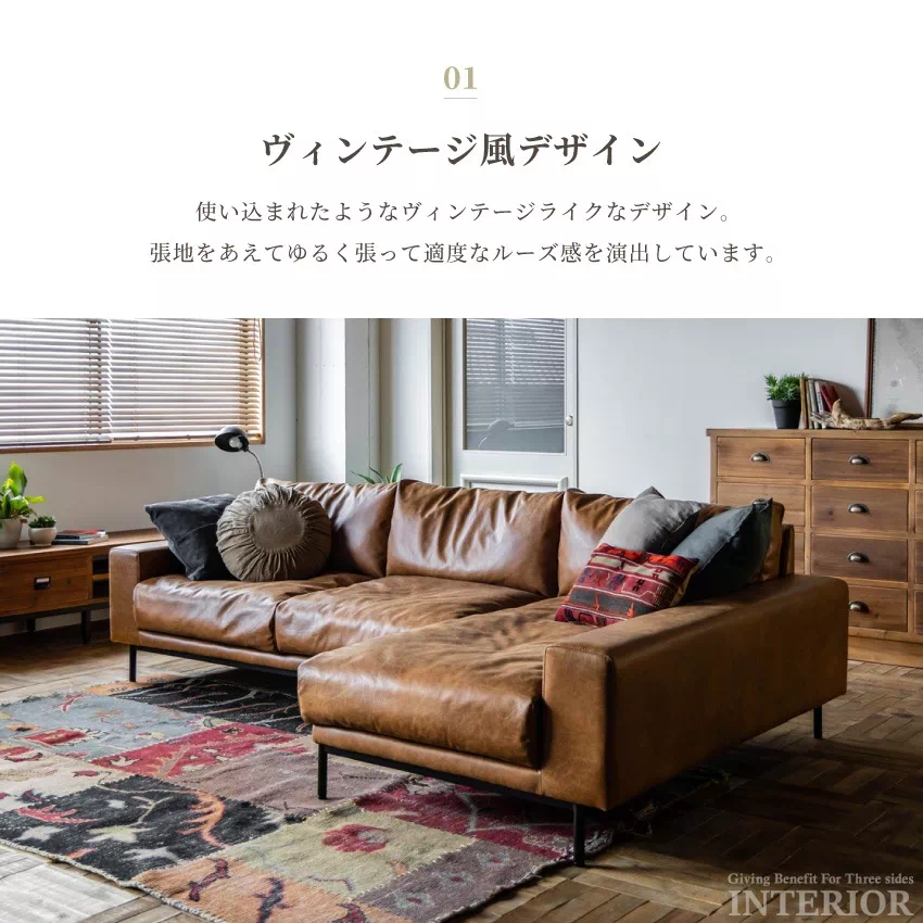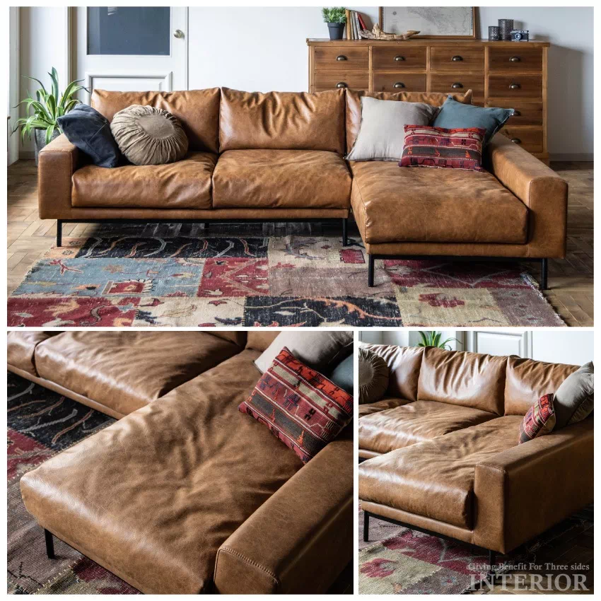 | 新素材スーパーレザーテックスを使用したカウチソファ。革の濃淡やしぼ感の表現にこだわり、上質な厚革の風合いをリアルに再現しました。張地はあえてルーズに張り、使い込まれたようなヴィンテージ感を演出。くったり沈み込むような座り心地で、体にやさしくフィットします。羽毛のように柔らかいフェザーをたっぷり使用しているため、とてもソフトな座面に仕上がっています。カウチ部分はお部屋の間取りに合わせて右と左からお好きな方をお選びいただけます。 |