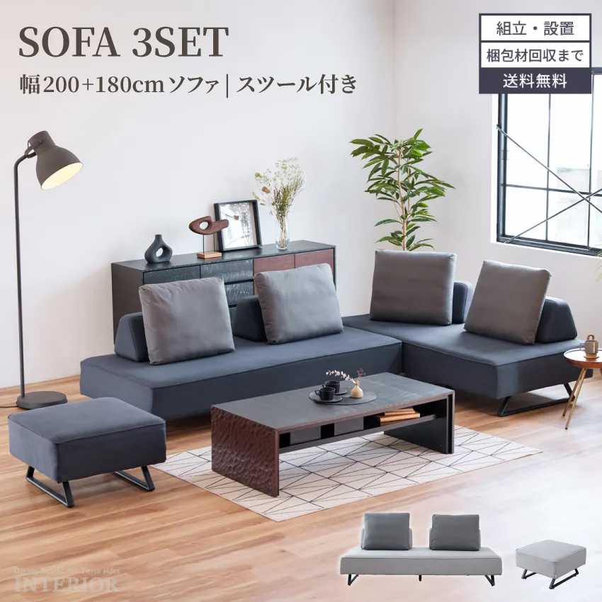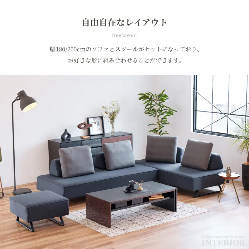 | ソファ200:W200×D90×H88(SH40)cm ソファ180:W180×D90×H88(SH40)cm スツール:W65×D65×H40cm |