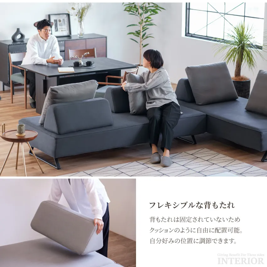 | 自由に動かせる背もたれと単独スツール付きのアイランドソファ。3点セットのためお好きな形に組み合わせることができ、さまざまなシーンで活躍します。座面にはSバネやウレタンなどを採用し、適度な弾力で長時間座っていても疲れにくい座面を実現。さらに、日本初・国内唯一の特許技術で製造しているライトウェーブを使用しています。ライトウェーブは高耐久で、水洗いやアルコールでの消毒が可能。通気性もよく水洗いも可能なため、常に清潔な状態をキープできます。ソファにはふかふかのクッションが2つ付属します。 |