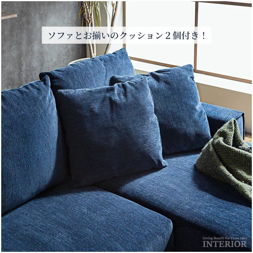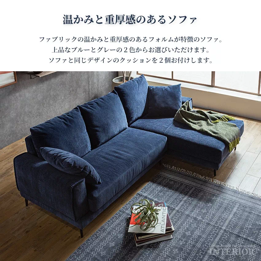 | ファブリックの温かみと重厚感のあるフォルムが特徴のソファです。幅210cmあるので、家族団らんで座ったり、ひとりで伸び伸びくつろいで座ることもできます。上品なカラーのブルーとグレーからお選びいただけます。足元はお掃除ロボットが通れるほどの十分な脚高があり、留守中でもお掃除可能です。ソファと同じデザインのクッションが2個付きます。 |