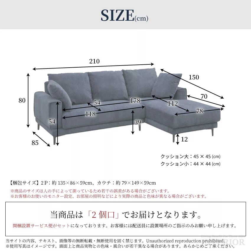 | カウチソファ:W147×D77×H58(cm) 2Pソファ:W134×D84×H58(cm) 全体サイズ:W210×D150×H80 SH39(cm) 【梱包サイズ】2P:135×86×59、カウチ:79×149×59(cm) |