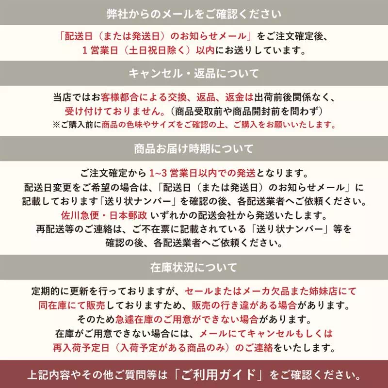 | 当店の家具には、保証書が付属しておりません。商品の保証は、メーカー保証にて商品到着より1年間となります。※一部商品を除く。 ご理解の程、宜しくお願い申し上げます。ご不明な点等ございましたら、当店までご連絡の程よろしくお願い申し上げます。 |