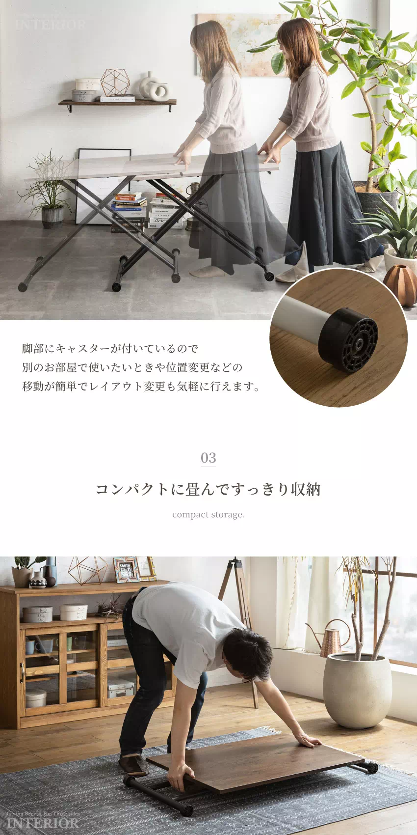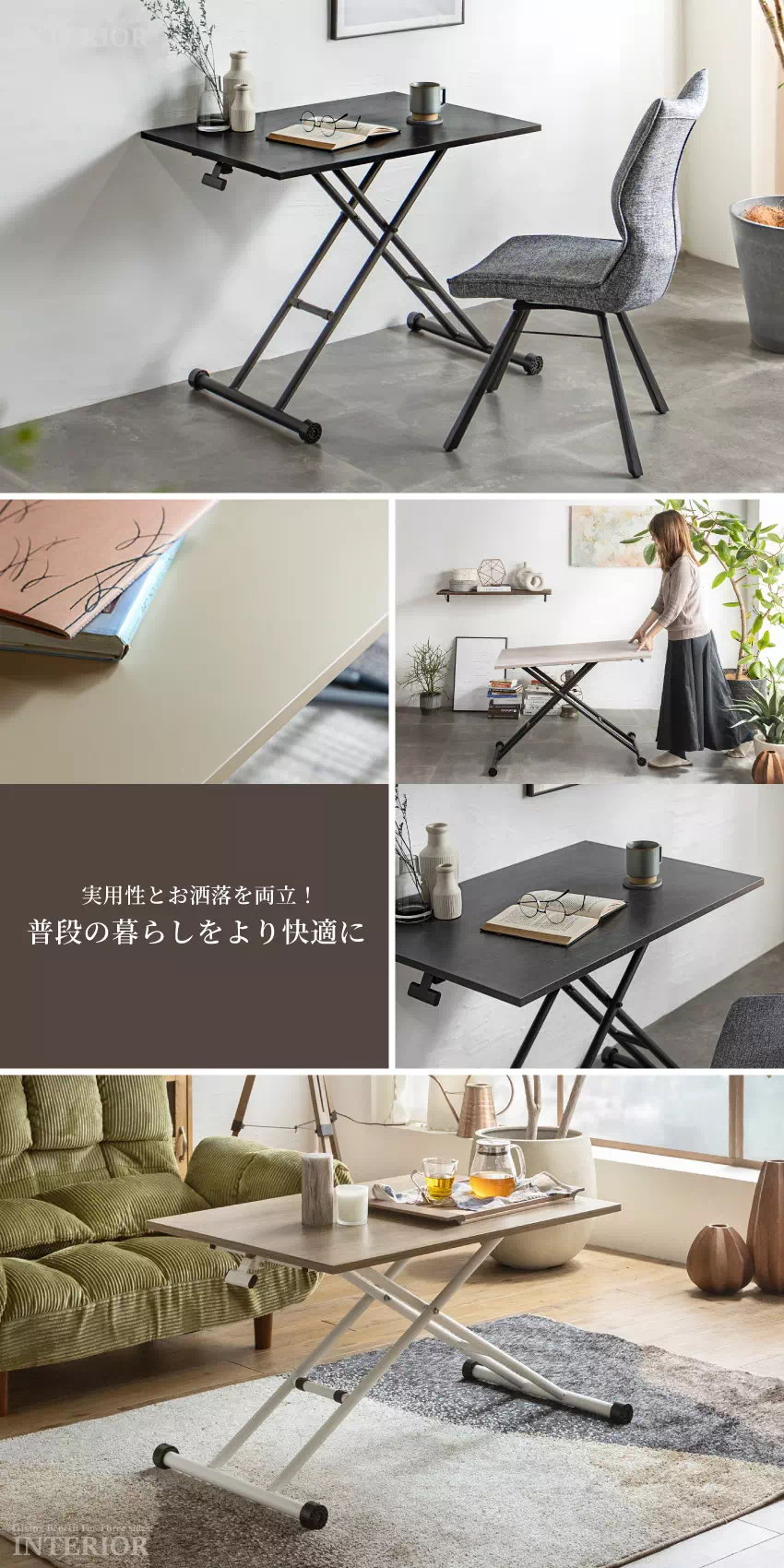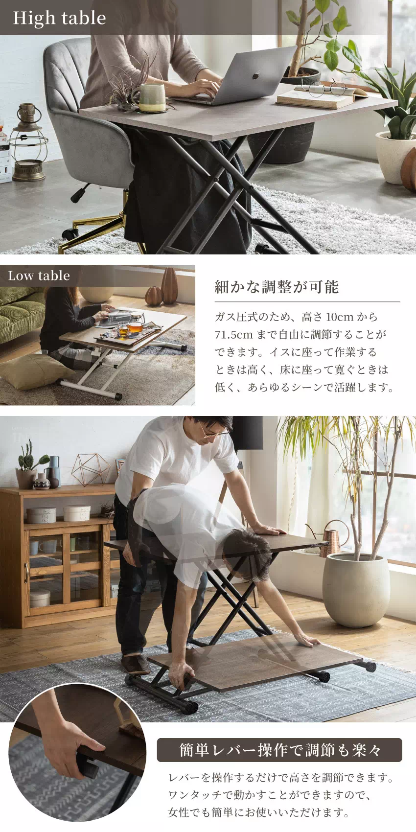 | ライフスタイルやシーンに合わせて高さを調節できるから様々な使い方ができます。移動もラクラクできて使う場所を選びません。マルチに何役もこなす便利なテーブルです。 |